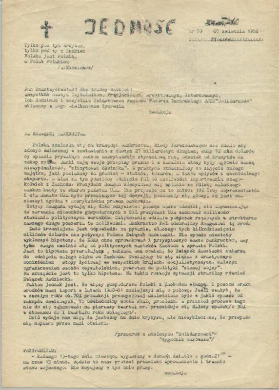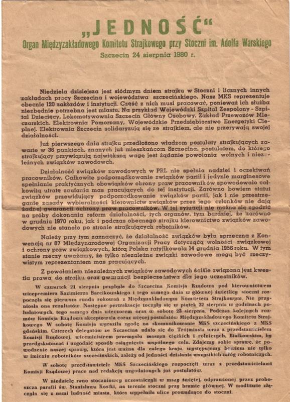 Jest niedziela 24 sierpnia 1980 roku. W Szczecinie od siedmiu dni trwają strajki. Międzyzakładowy Komitet Strajkowy skupia 120 zakładów pracy. Tego upalnego dnia ukazuje się pierwszy numer organu MKS pt. „Jedność". Zawiera m.in. informacje o stopniu zaawansowania rozmów między Komisją Rządową a MKS oraz Apel Intelektualistów Polskich. Biuletyn miał nakład 5 tys. sztuk i został wydrukowany w Fabryce Papieru „Skolwin".