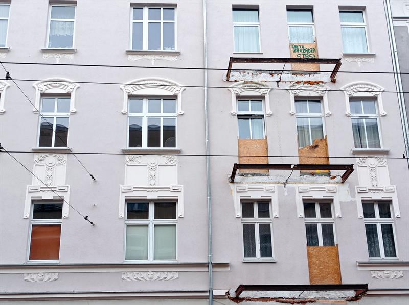 Co bardziej zniecierpliwieni mieszkańcy z ostatniej kondygnacji płytę paździerzową, którą zabite zostały od dołu otwory okienne w części na drzwi balkonowe, opatrzyli napisem o treści: „TAK TU RZĄDZI STBS". Takimi samymi płytami z paździerza wypełnione są wszystkie miejsca wyjść na pięć pozostałych balkonów, których…nie ma. Z lica muru wystają wciąż jedynie stalowe żerdzie obrzeży, elementy konstrukcyjne pod urządzenie w nich warstw podbudowy nowych balkonowych posadzek.