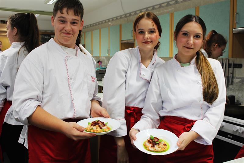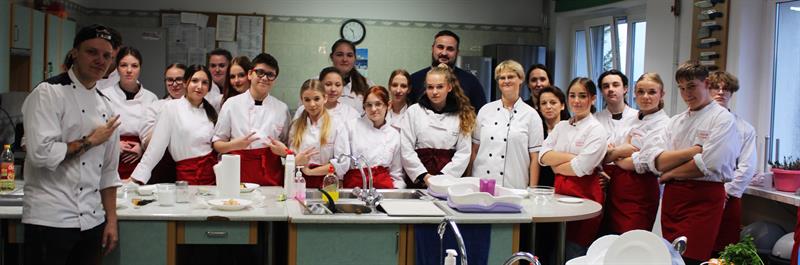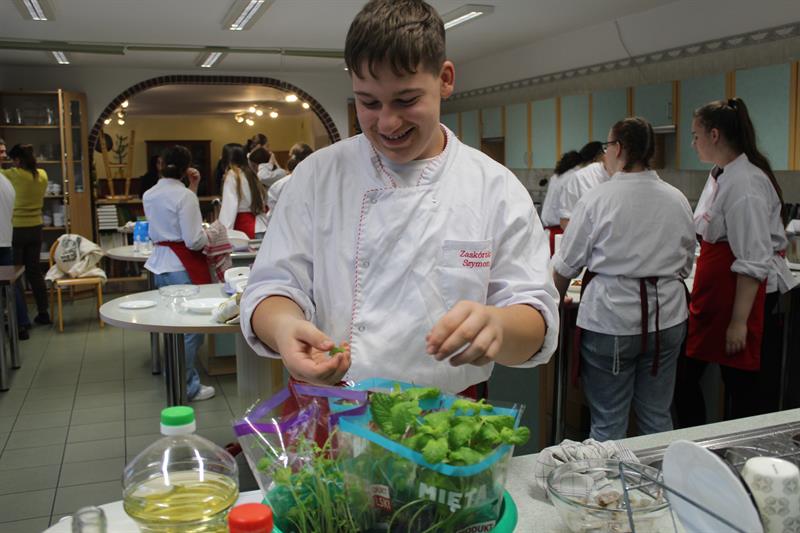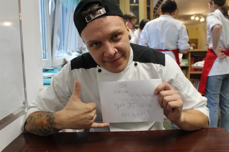 Uczniowie klas o profilu technik żywienia i usług gastronomicznych mieli okazję zobaczyć i uczyć się przygotowywania fantazyjnych przystawek od Jarosława „Jojo" Grudy, zwycięzcy 7. edycji programu „Hell’s Kitchen". Pan Jarosław pochodzi z miejscowości Strzelewo w gminie Nowogard i był honorowym gościem warsztatów kulinarnych.