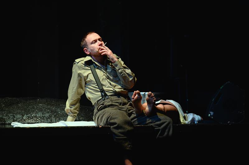Rzecz zaczyna się w wojennym lazarecie, może wprost na polu walki. Jeszcze snują się dymy po bitwie. Widzimy leżące ciała, lecz to nie zabici, a ranni - Makbet (Michał Kosela) i Banko (Jacek Zdrojewski), wodzowie i przyjaciele, doświadczeni bojem.