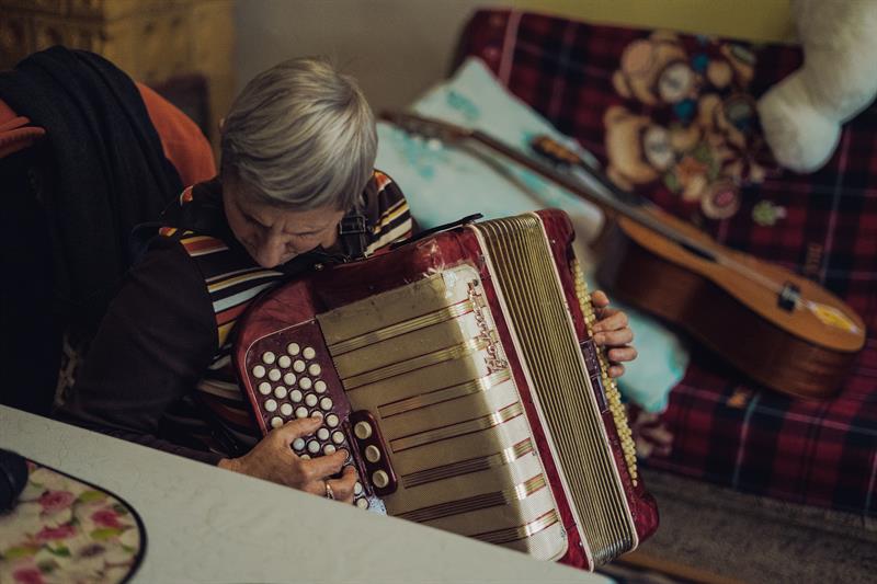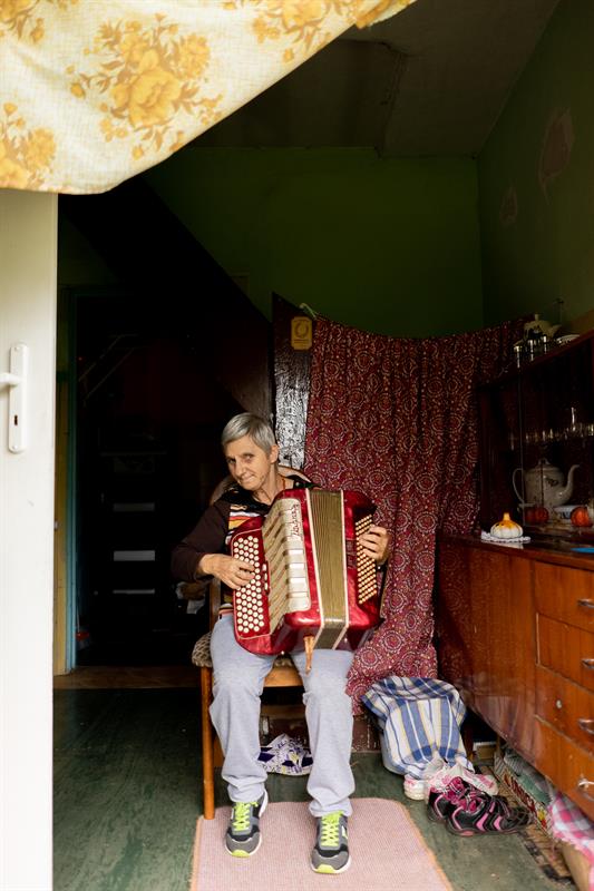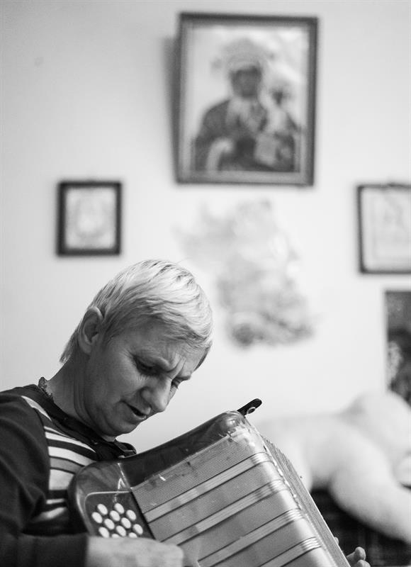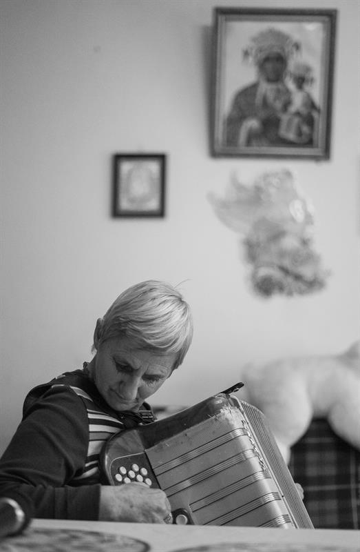 Najciekawsze wydarzy się za chwilę. Zza drzwi mieszkania, w którym mieszka Krystyna Pięta, dochodzi żwawa ludowa melodia. Kiedy je otwieramy, naprzeciw wejścia wita nas malutka starsza pani z akordeonem.