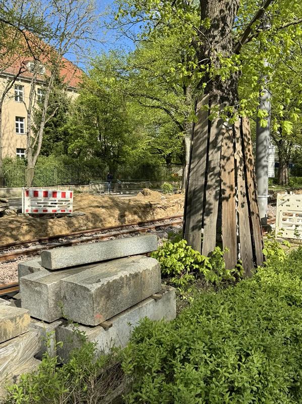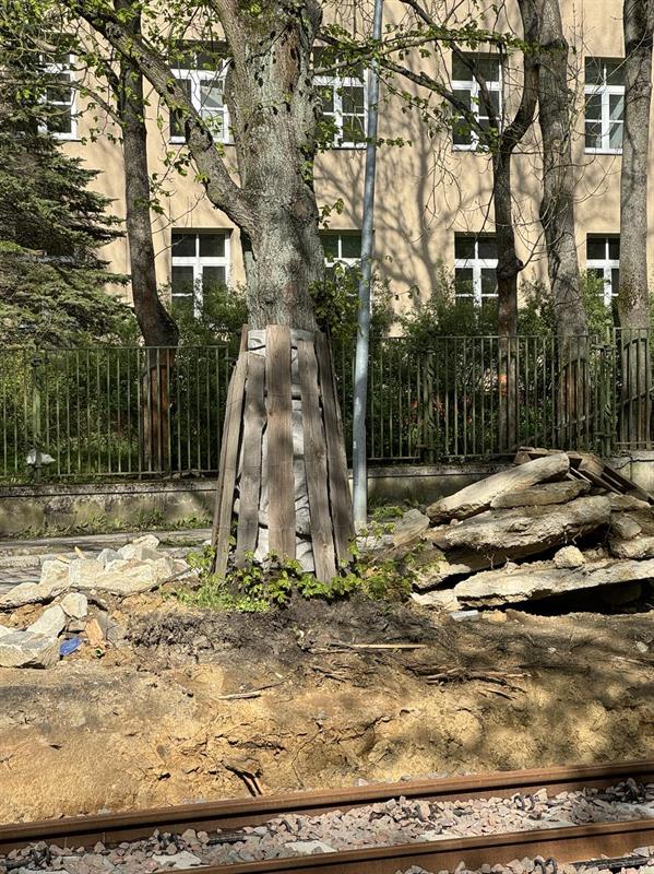 Wokół drzew nie zastosowano strefy buforowej. Wykopy były prowadzone bezpośrednio przy drzewach, uszkadzając ich bryły korzeniowe. Ciężkie materiały i gruz nadal są składowane bezpośrednio przy pniach.