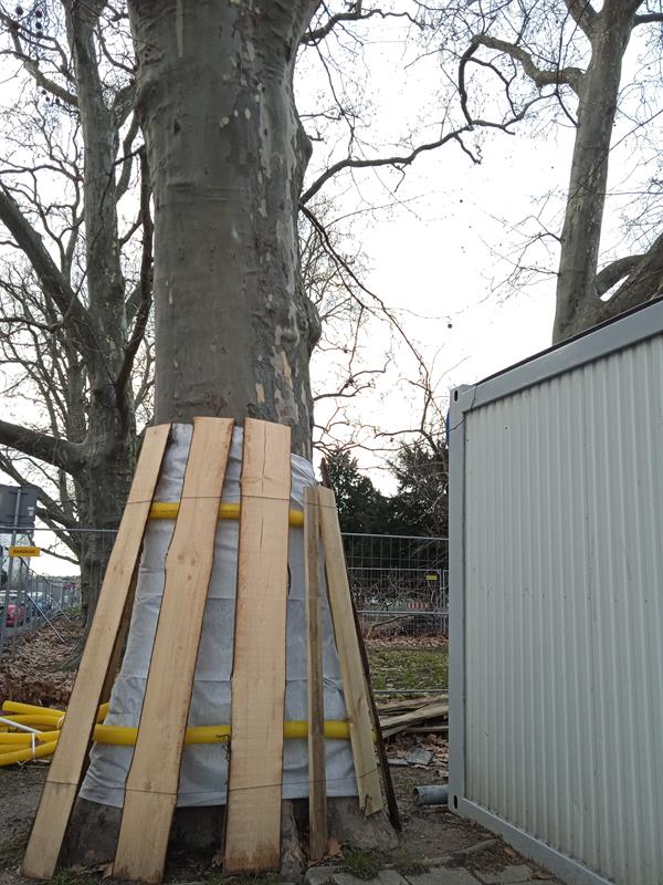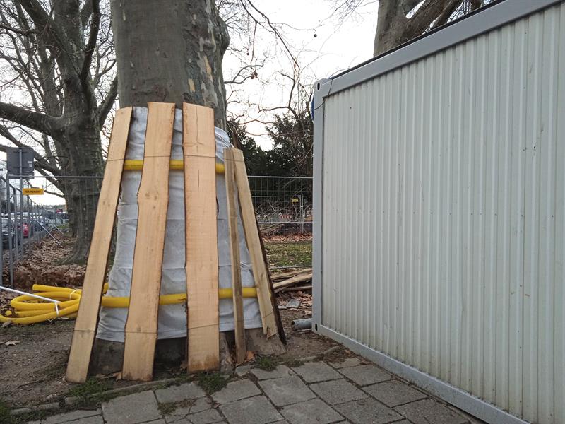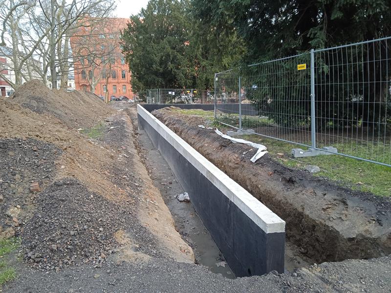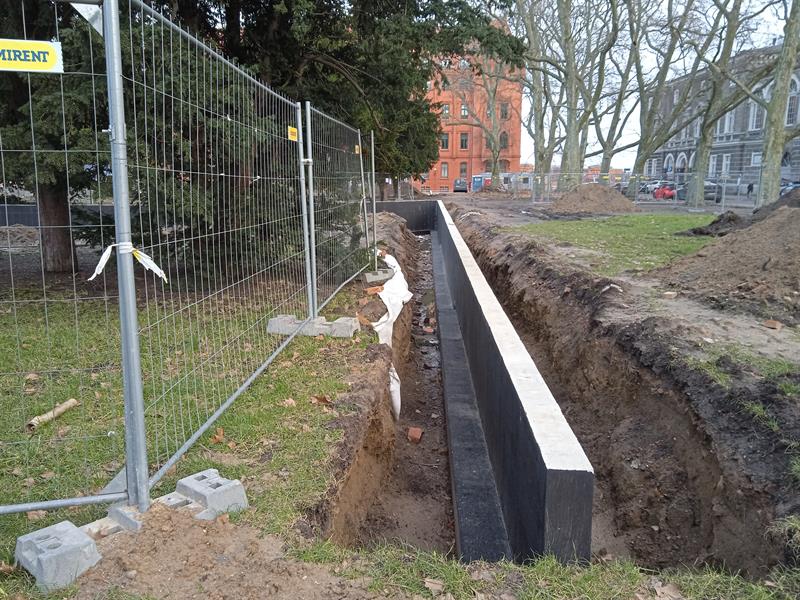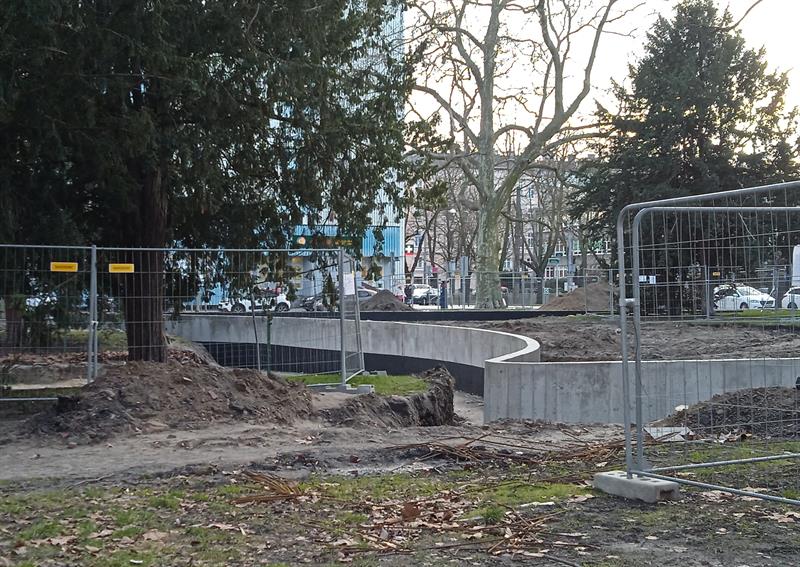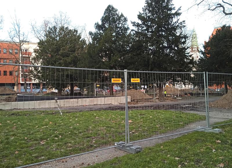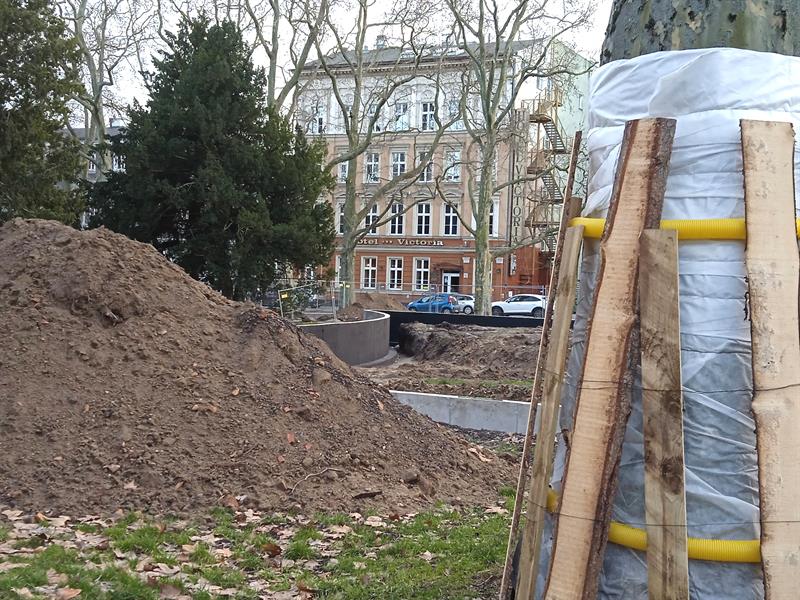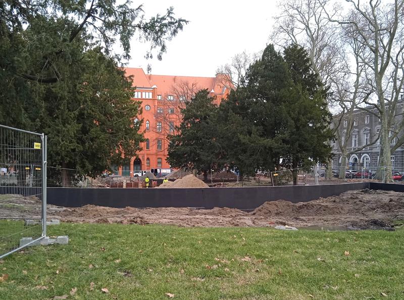 Po dawnym basenie przeciwpożarowym nie ma śladu. Już widać krzywizny konstrukcji okalających przyszłą fontannę. W wykopach pojawiają się kolejne żelbetowe mury. Natomiast w strefie ochronnej jednego z wiekowych platanów - wbrew standardom ochrony zieleni - posadowiono ciężki budowlany kontener. Tak postępuje przebudowa pl. Batorego.