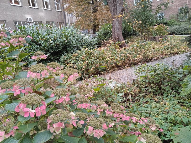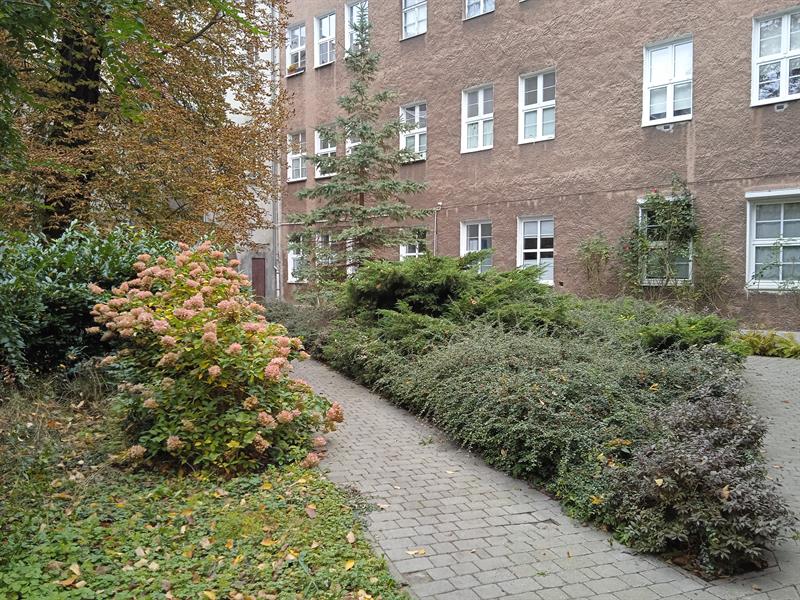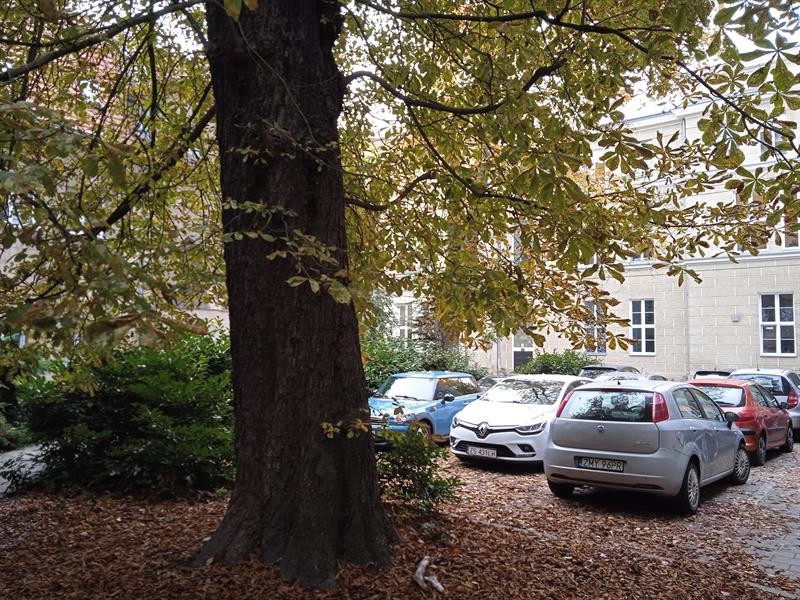 Wysokie wiekowe drzewa, a wokół nich rabaty z laurowiśni i efektownych hortensji - na tle starej zabytkowej zabudowy oraz siedziby Zarządu Budynków i Lokali Komunalnych. Swoisty minipark, choć pozbawiony ławek. Za to spora część przyległego terenu jest zajęta pod parking. Dziki, bo wyłączony z obowiązującej wokół kosztownej staromiejskiej Strefy Płatnego Parkowania. Auta stoją w nim ciasno, w czterech rzędach, niemal na styk.