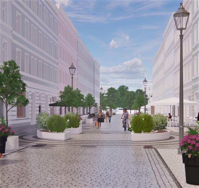 Uwielbiam takie wizualizacje jak ta. Na obrazku widzimy rowerzystę dumnie mknącego swoją kolarzówką przez deptak. Ten kto to tworzył, chyba nie zauważył ze na deptaku jest położony bruk a właściwie to kocie łby, po których bardzo ciężko się jeździ rowerem, a już na pewno, kolarzówką z wąskimi oponami. Takie wizki pokazują ze projektanci żyją w innym świecie i nie mają pojęcia a życiu zwykłych mieszkańców, tj rowerzyści.