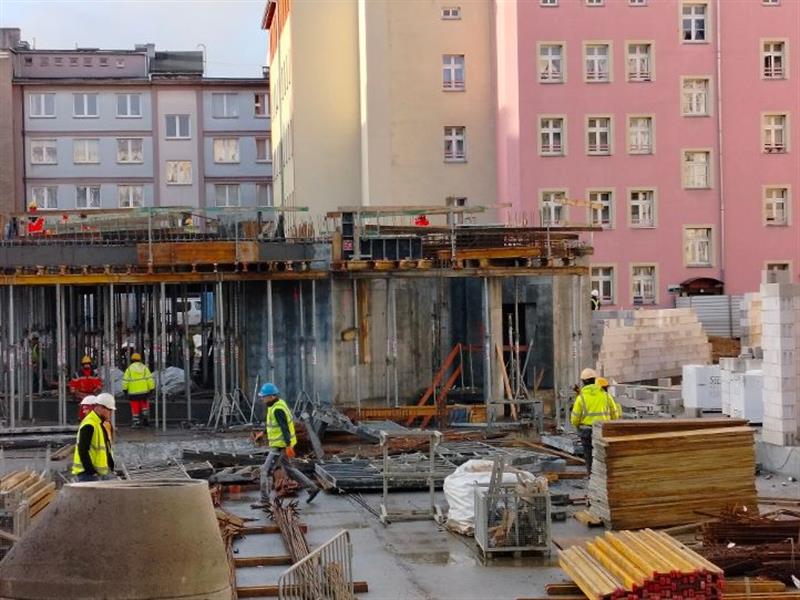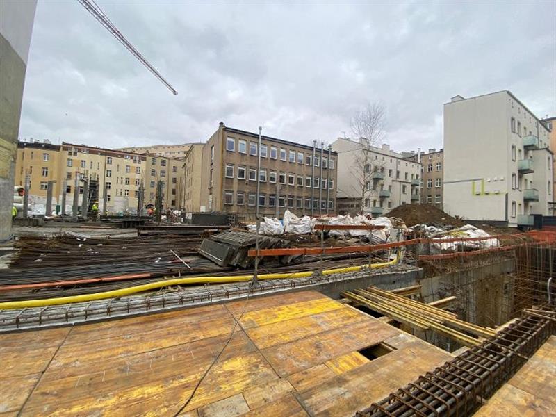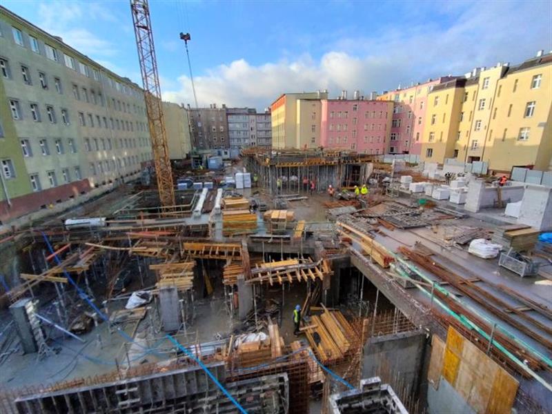 - Prowadzony jest monitoring geodezyjny budynków sąsiadujących z placem budowy, wykonano kolejne słupy żelbetowe w obrębie płyty fundamentowej garażu, a także przeprowadzono roboty instalacyjne związane z usuwaniem kolizji z istniejącą infrastrukturą - o sytuacji na budowie informuje Tomasz Klek, rzecznik prasowy miasta ds. mieszkalnictwa. - W ostatnich miesiącach ubiegłego roku zakończono szalowanie i zbrojenie ścian oraz podciągów w obrębie klatki schodowej jednego z nowych pawilonów. W budynku, w którym ma powstać parkingowiec, trwają prace na kondygnacji podziemnej. Wykonano elementy pionowe oraz zjazdy do garażu podziemnego, w miarę postępów prac, etapami, wykonywano ich szalowanie, zbrojenie