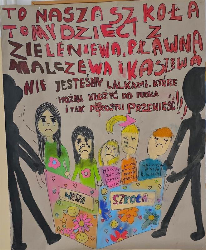 „To nasza szkoła. To my, dzieci z Zieleniewa, Pławna, Malczewa i Kaszewa. Nie jesteśmy lalkami, które można włożyć do pudła i tak po prostu przenieść". - plakat z takim napisem widnieje w korytarzu Szkoły Podstawowej w Zieleniewie. W ten sposób uczniowie wyrażają protest przeciwko zamiarowi likwidacji placówki.