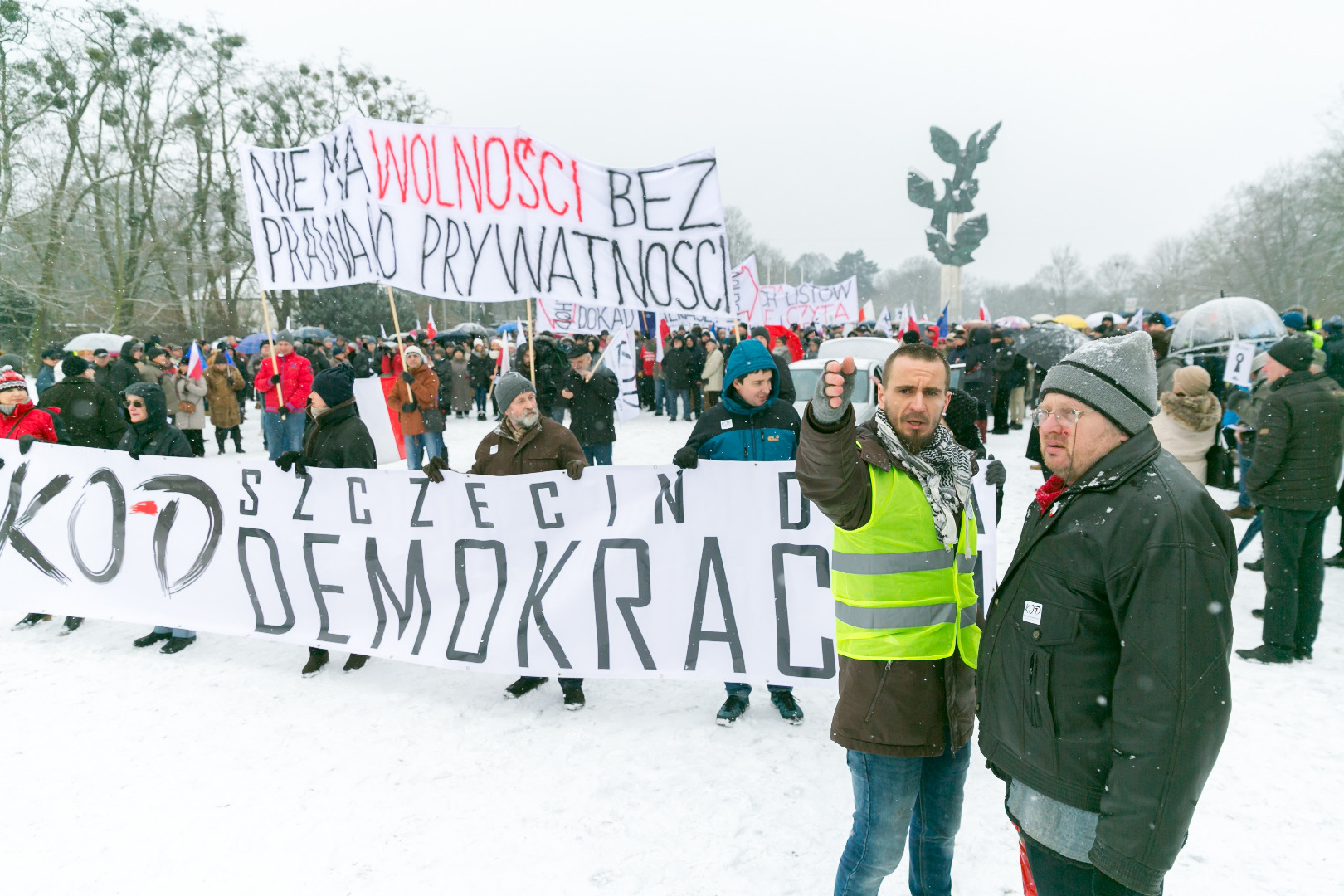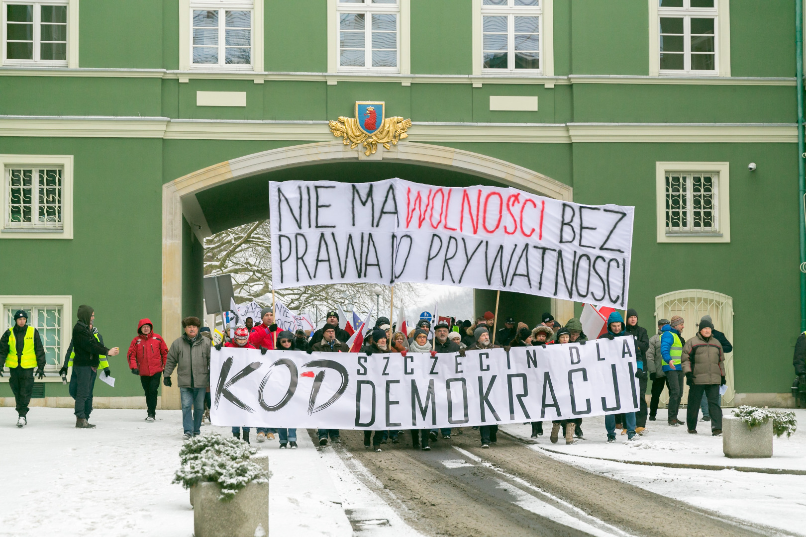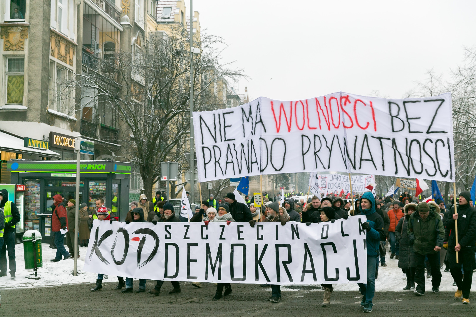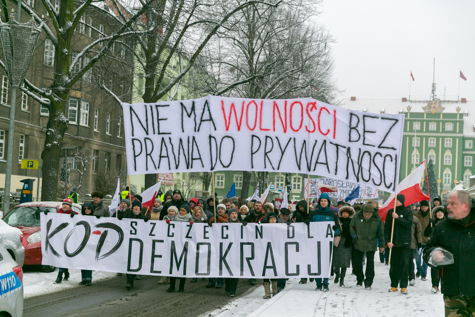 „Demokracja w Twoich rękach, pokaż Polsce, że nie pękasz", „Nie ma wolności bez prywatności" - takie m.in. hasła pojawiły się na transparentach podczas manifestacji zorganizowanej przez szczeciński Komitet Obrony Demokracji w sobotę (23 stycznia)