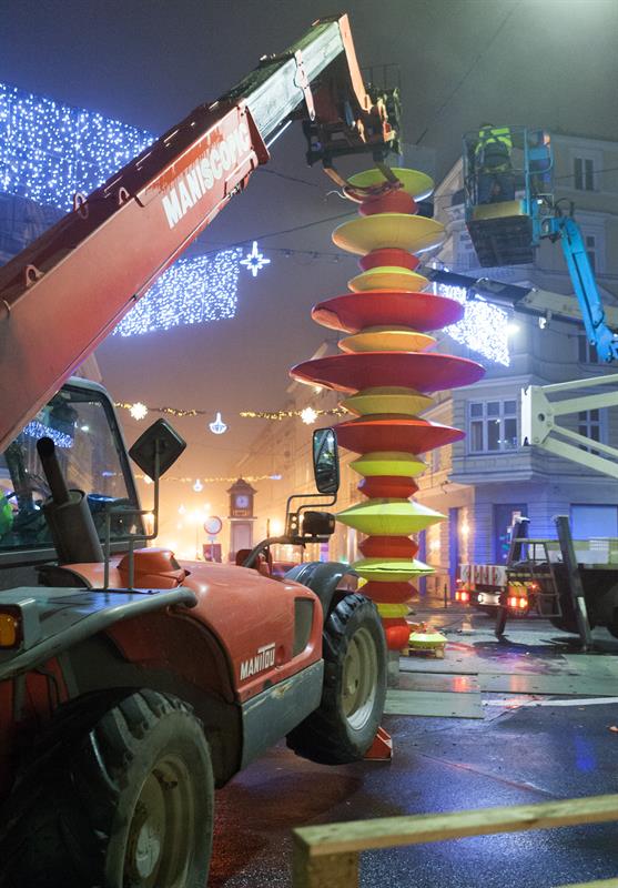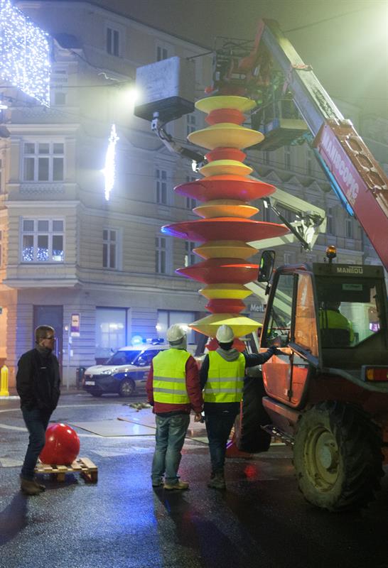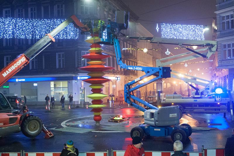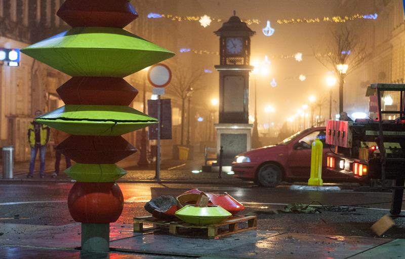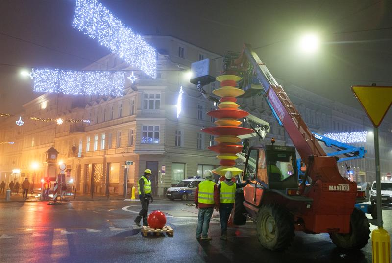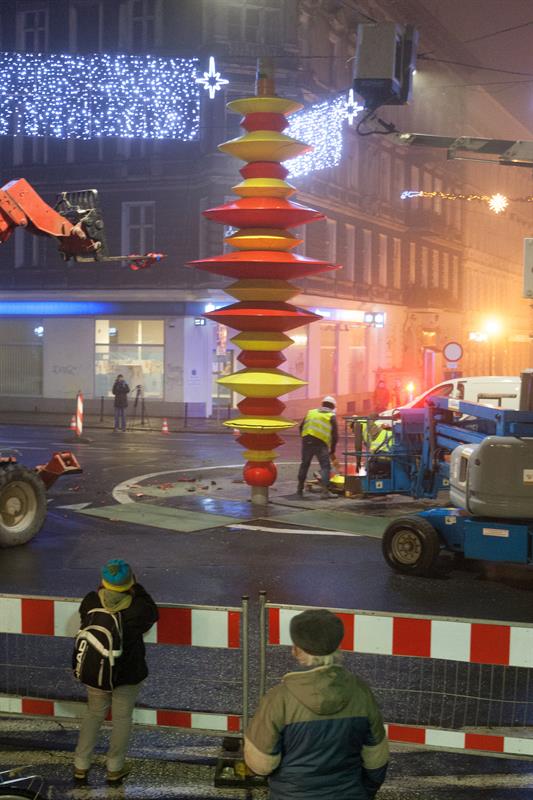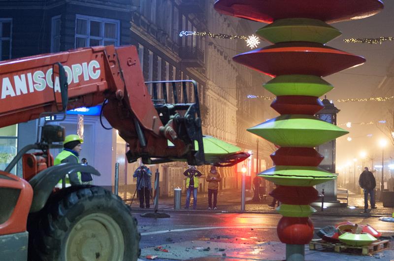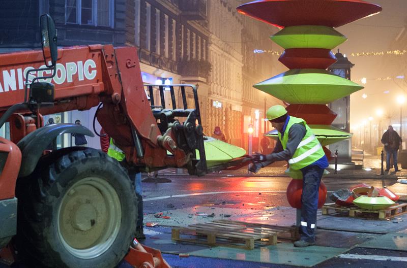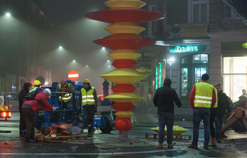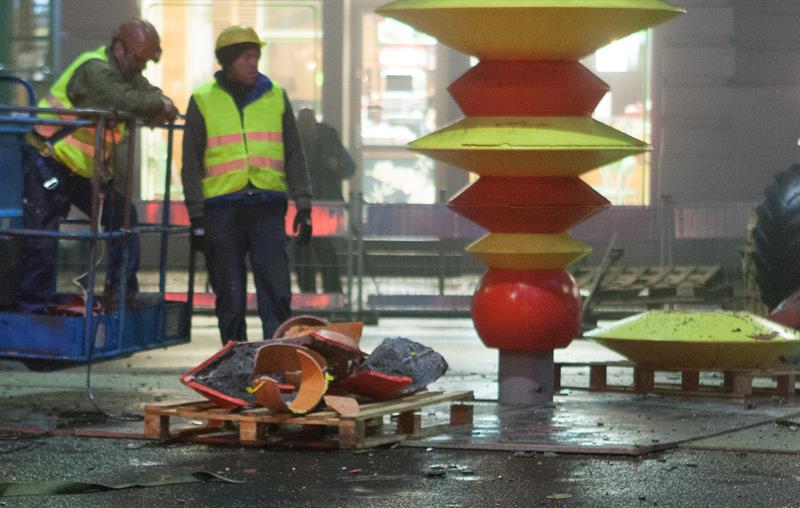 Trwa akcja demontażu Frygi. Prace prowadzone są przy użyciu trzech wysięgników. Poszczególne elementy są rozłączane za pomocą palnika. Cześć z nich trafiła już do kontenera na gruz.