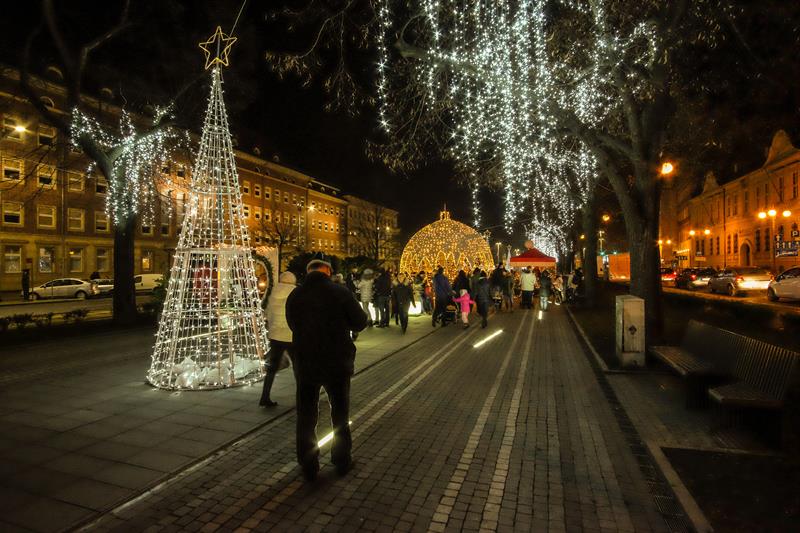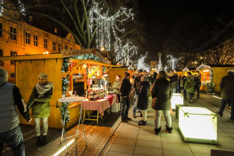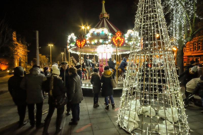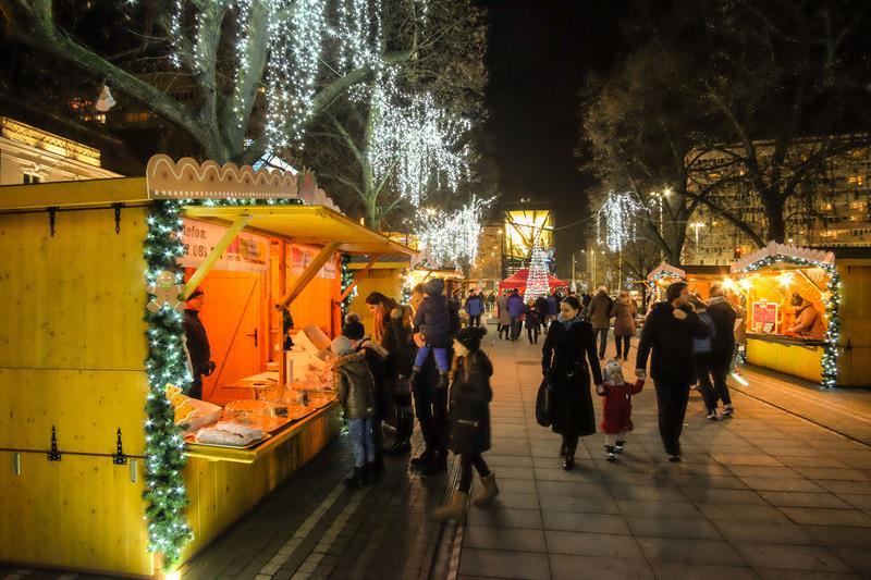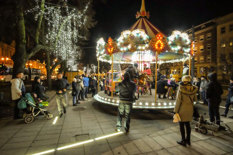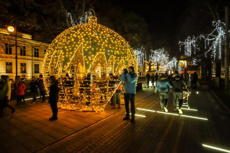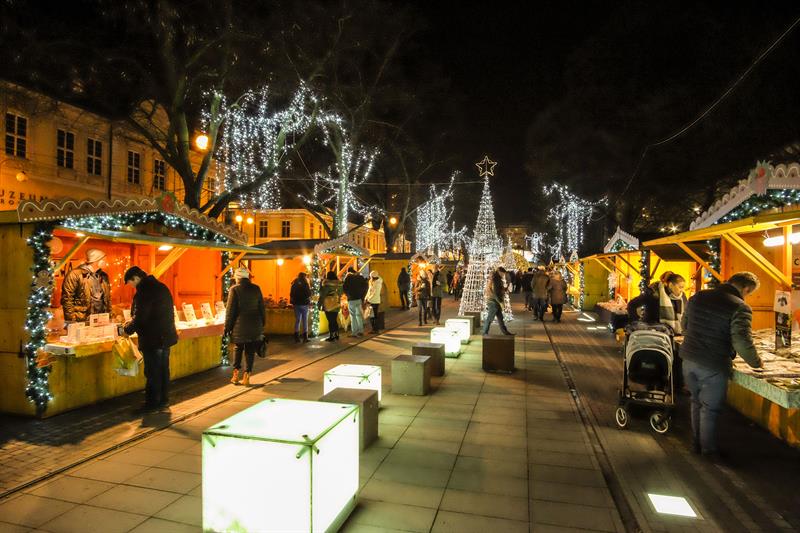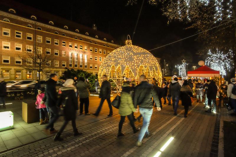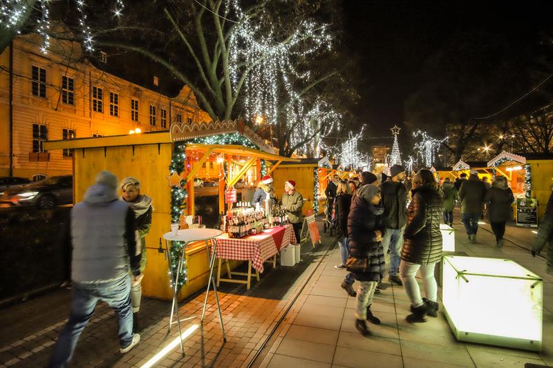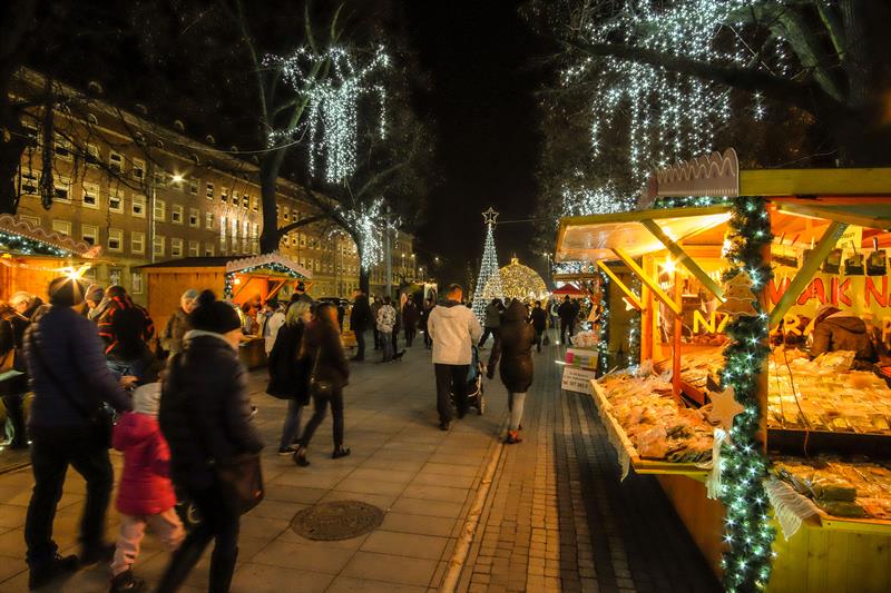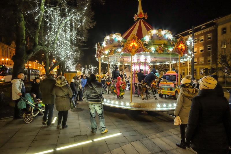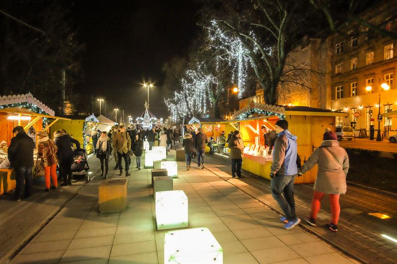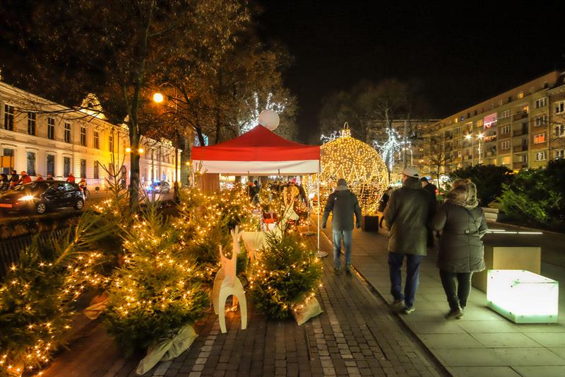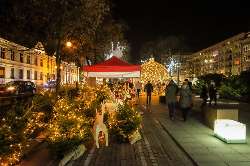 Szczeciński Jarmark Bożonarodzeniowy najpiękniej wygląda po zmierzchu, gdy rozświetlają się kolorowo. Impreza zyskuje wtedy niezwykłą przedświąteczną atmosferę.