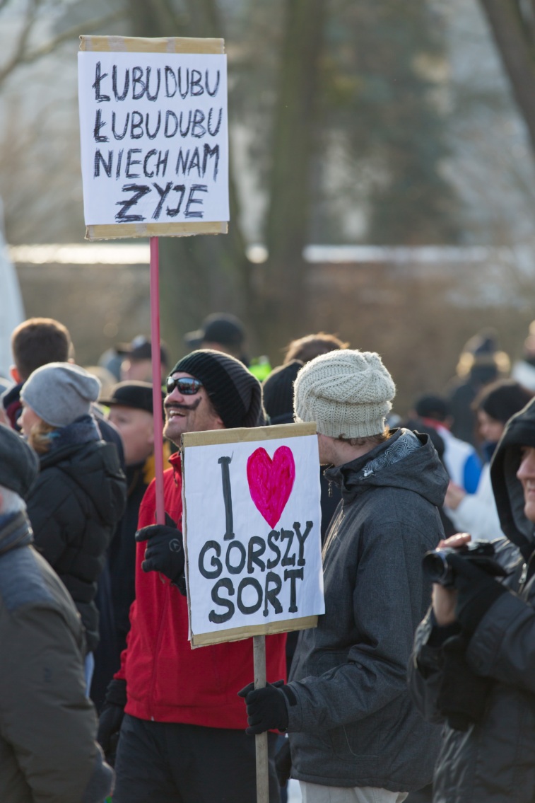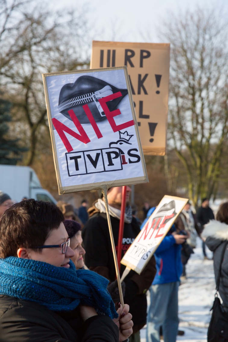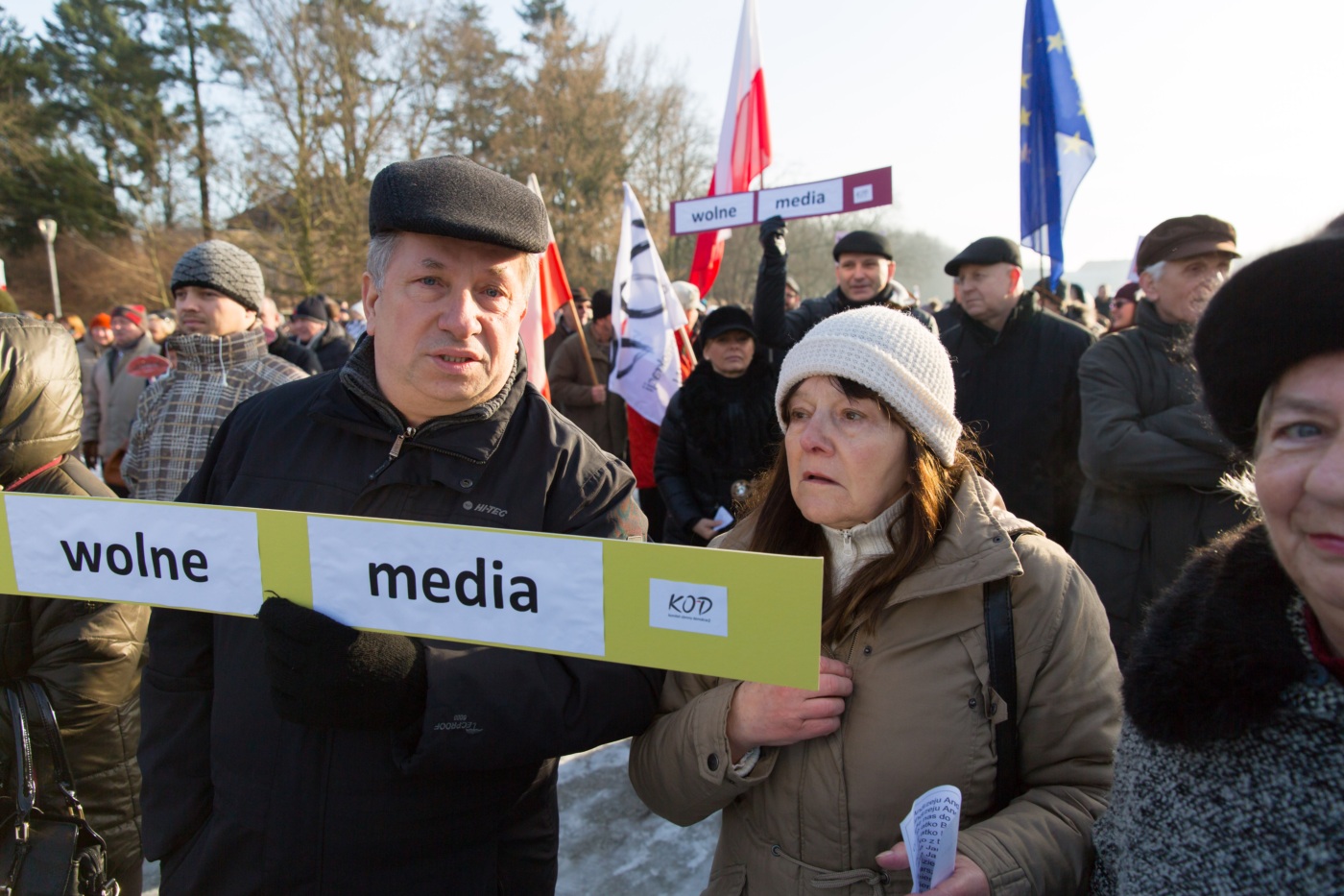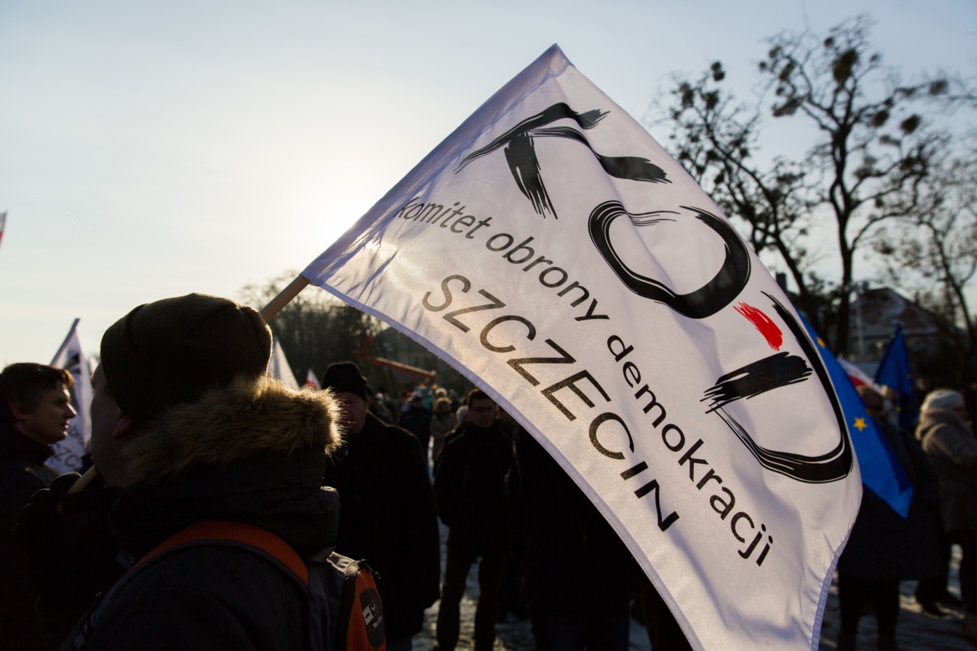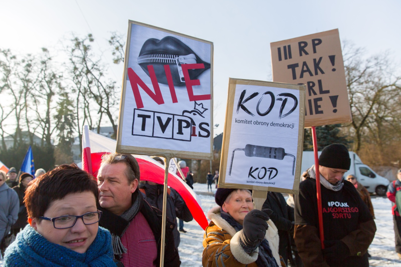 Pikieta zwolenników Komitetu Obrony Demokracji na Jasnych Błoniach w Szczecinie (9.01.2016 r.).