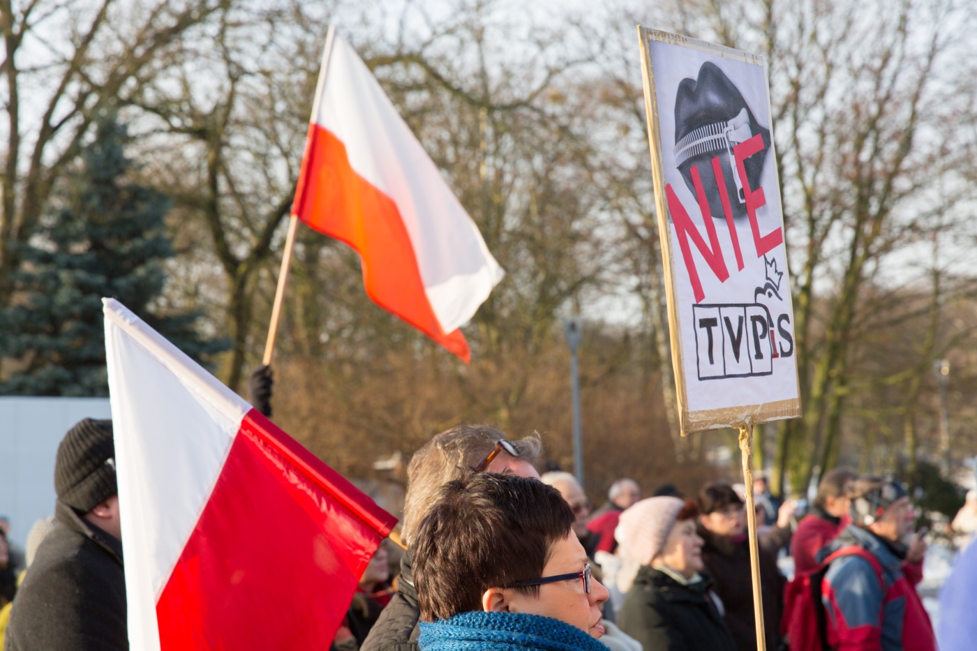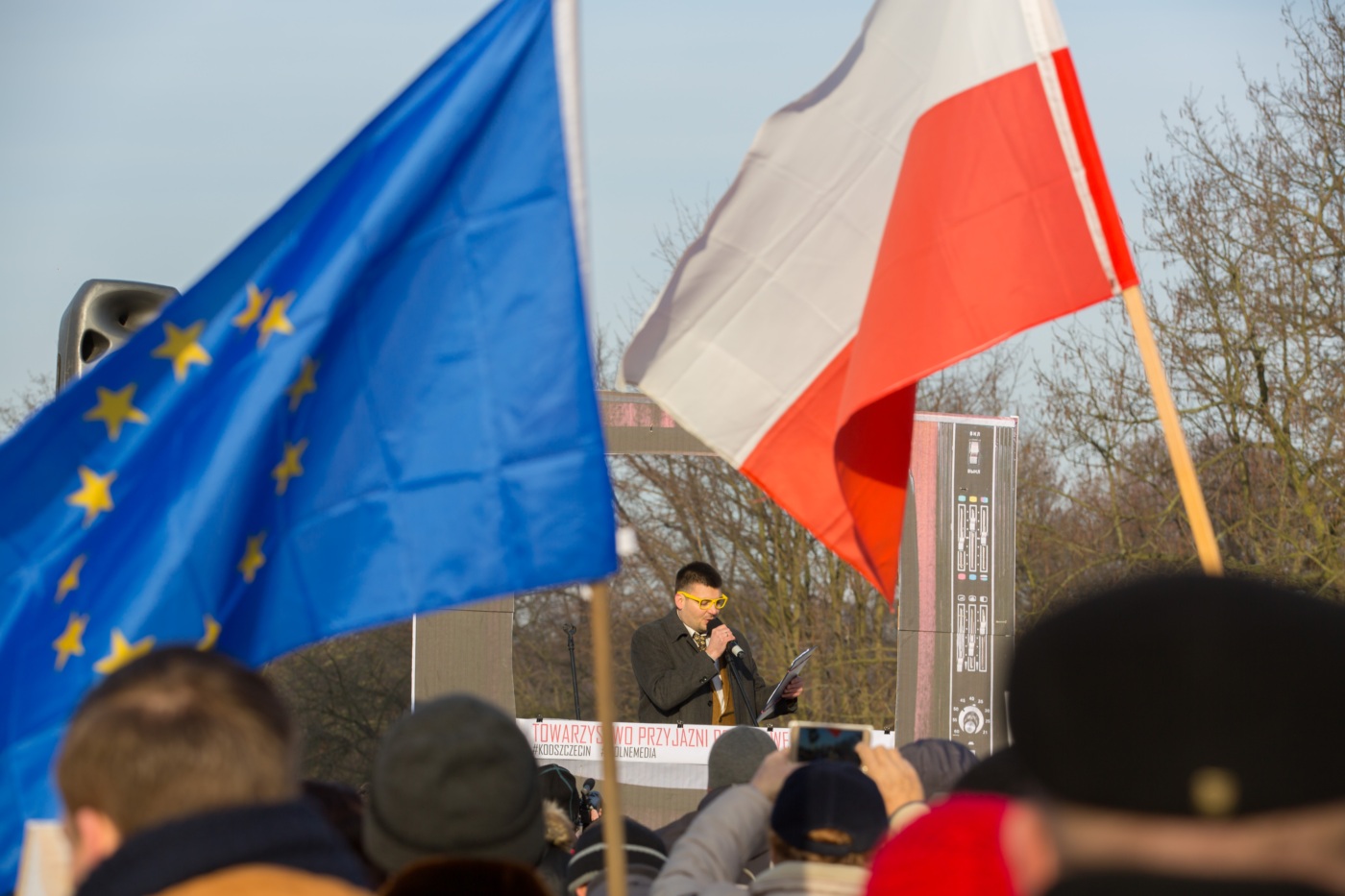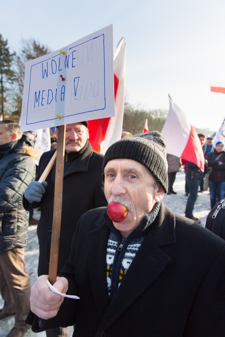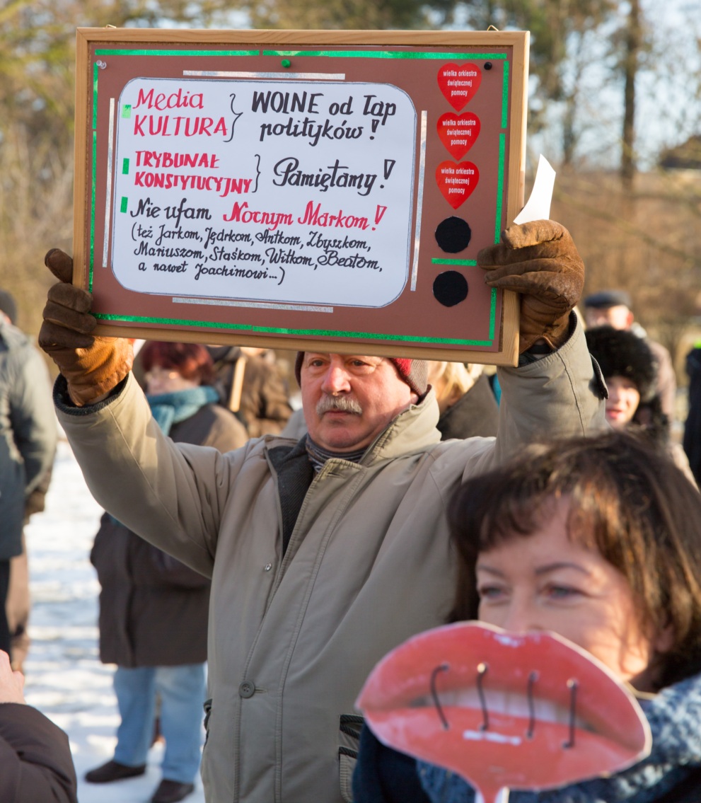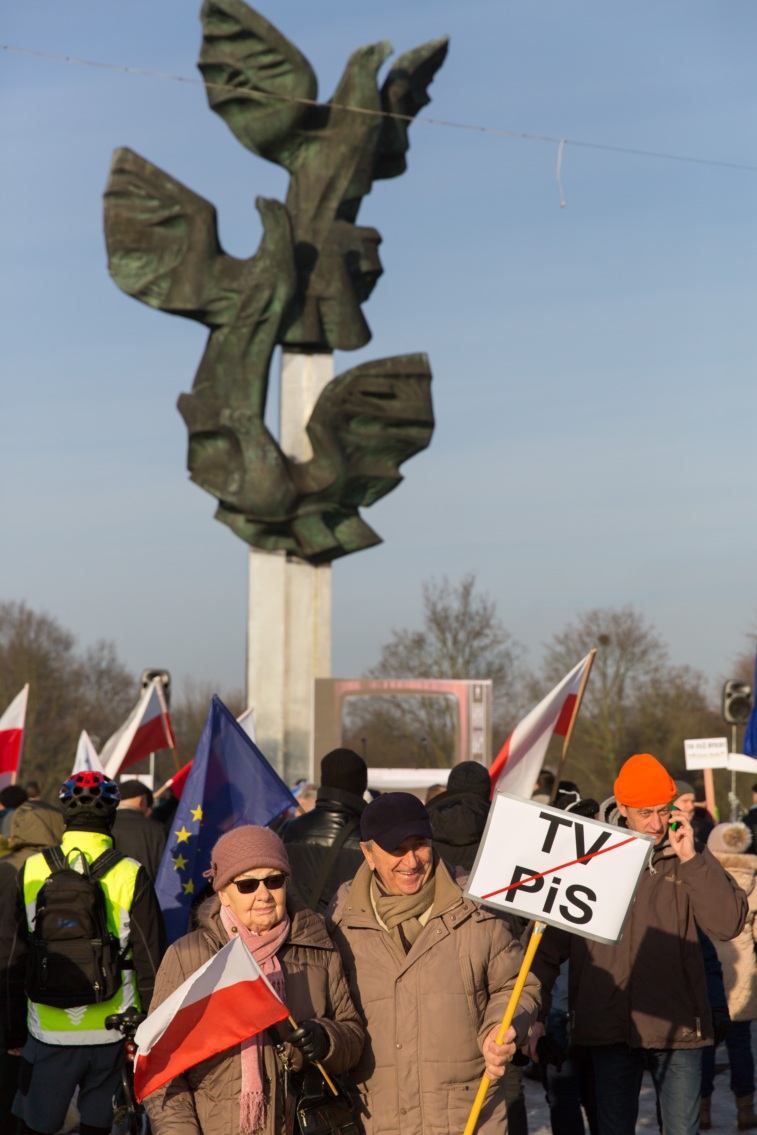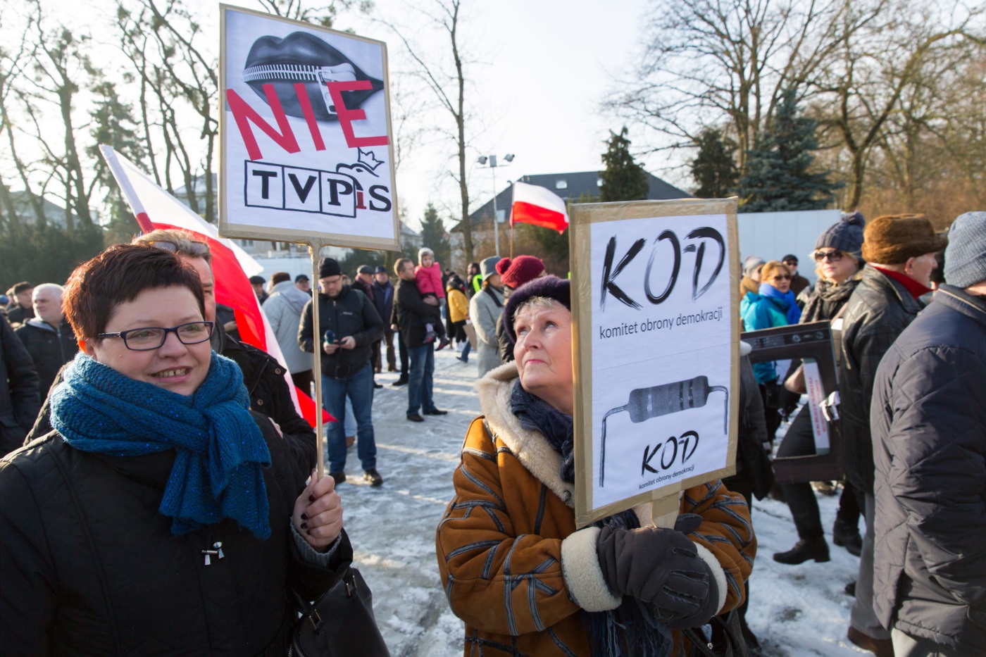 Pikieta zwolenników Komitetu Obrony Demokracji na Jasnych Błoniach w Szczecinie (9.01.2016 r.).
