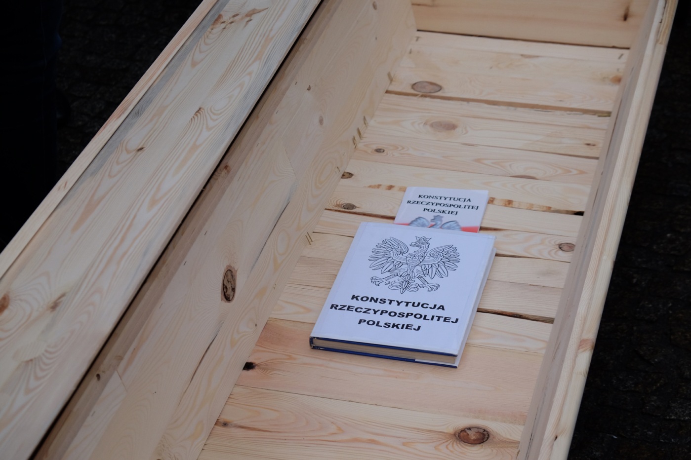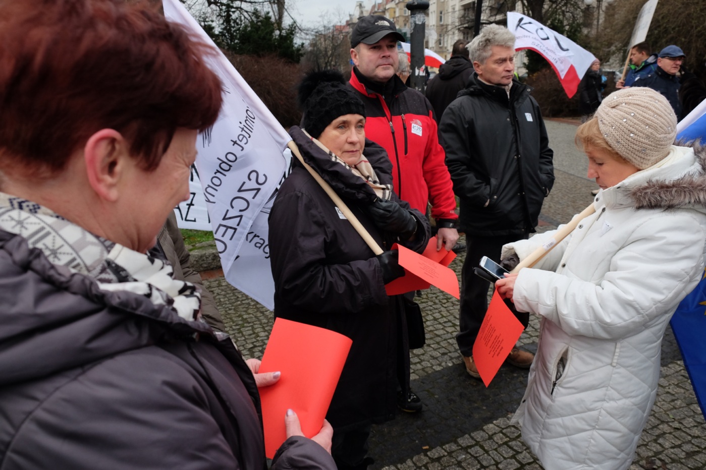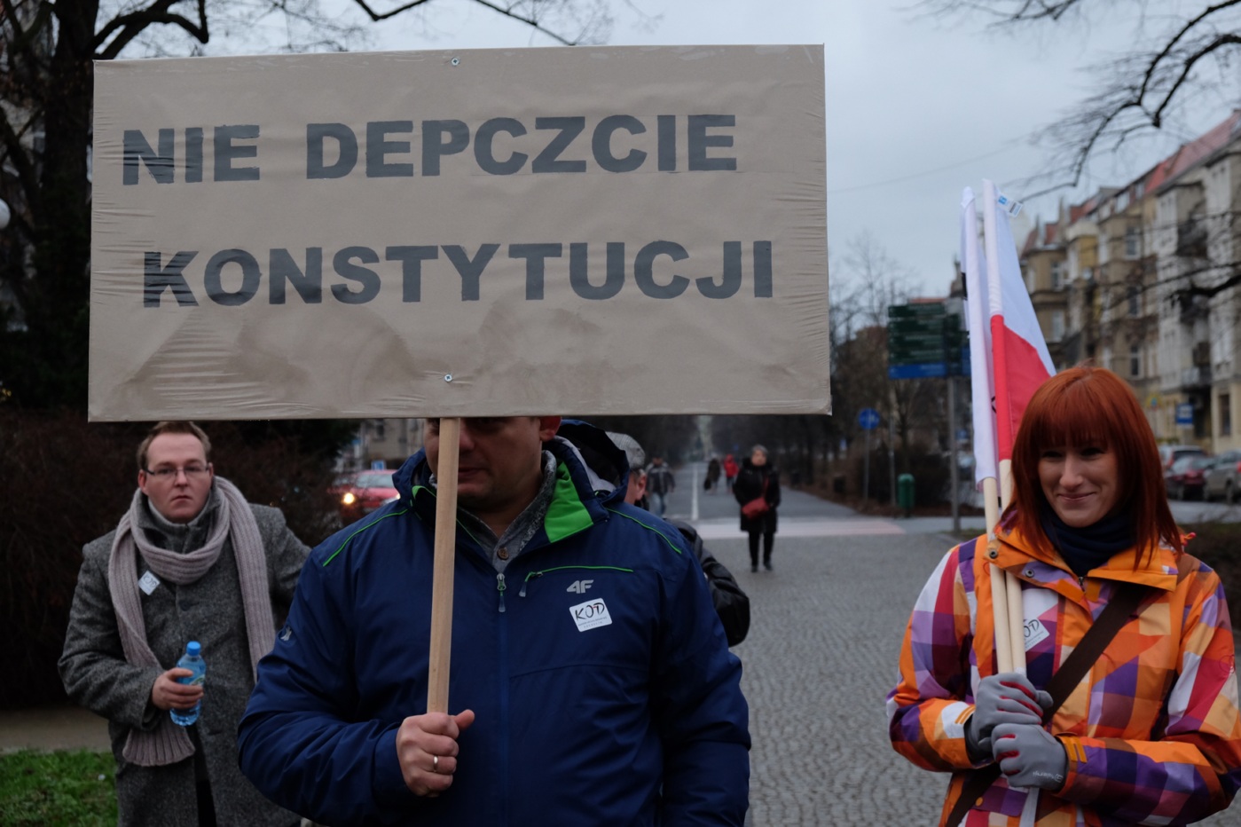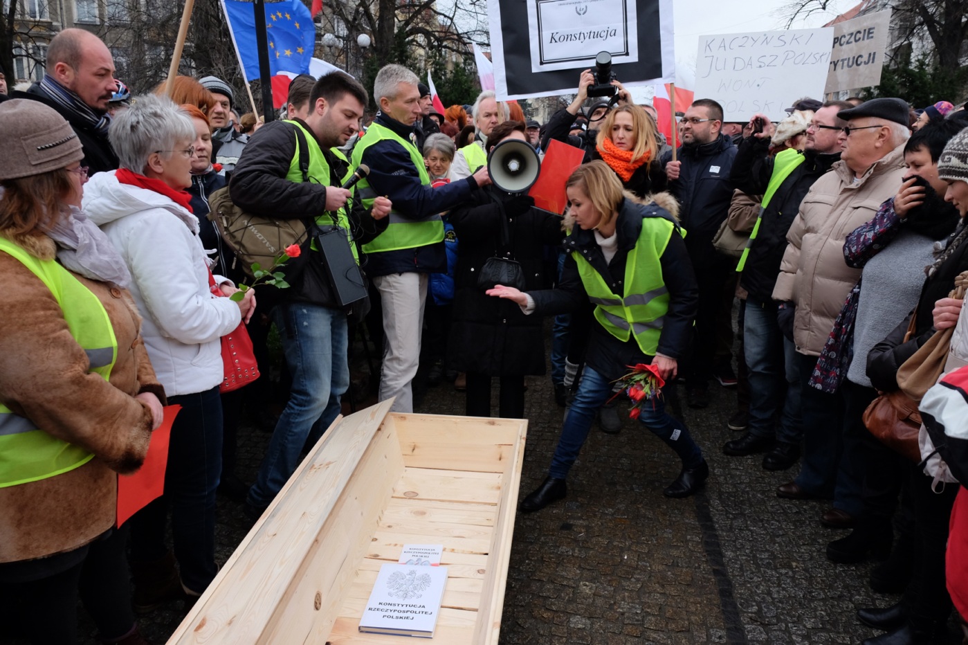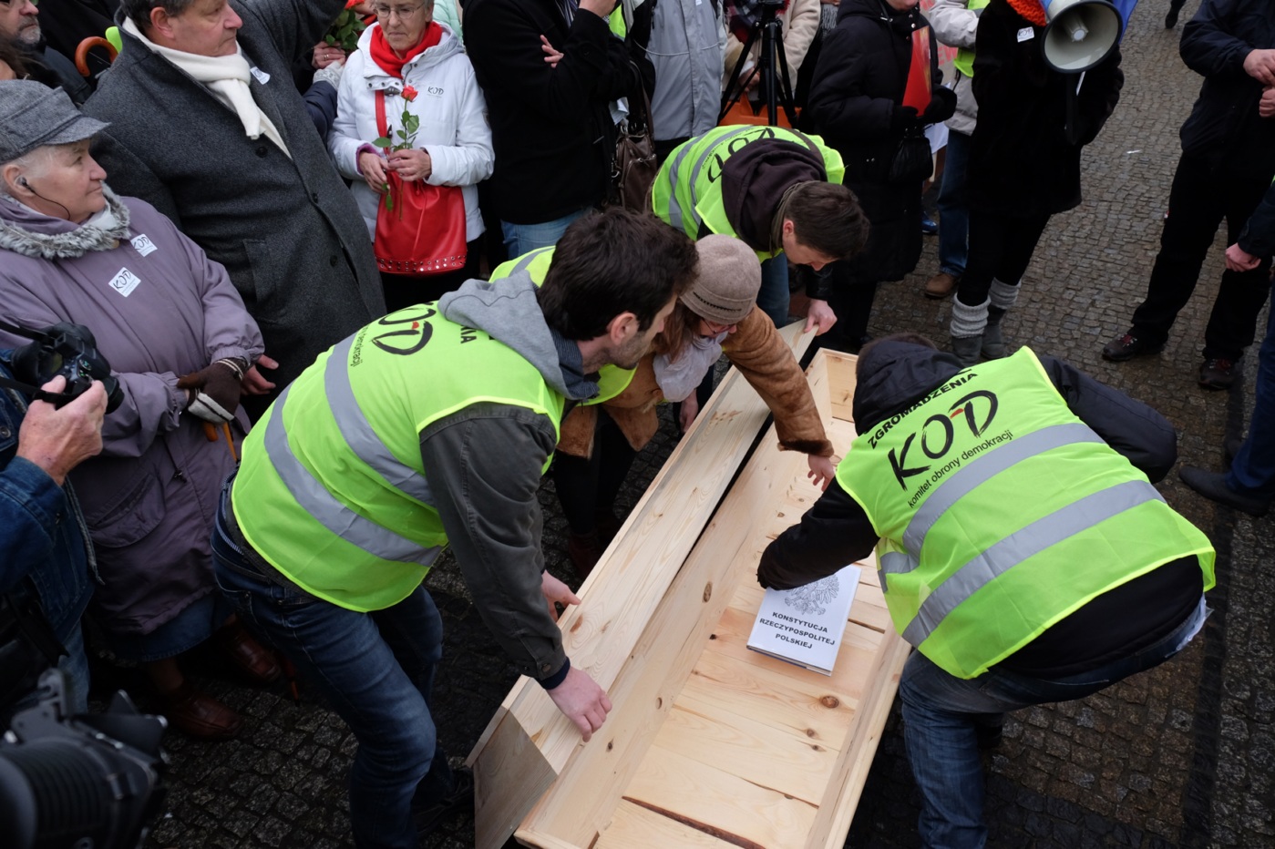 Kilkaset osób zebrało się w niedzielę (12.12.2015 r.) na pl. Grunwaldzkim w Szczecinie. Był to happening Komitetu Obrony Demokracji, który nie zgadza się z polityką rządu Prawa i Sprawiedliwości. W symbolicznej trumnie złożono Konstytucję RP.