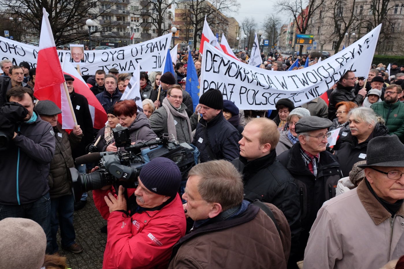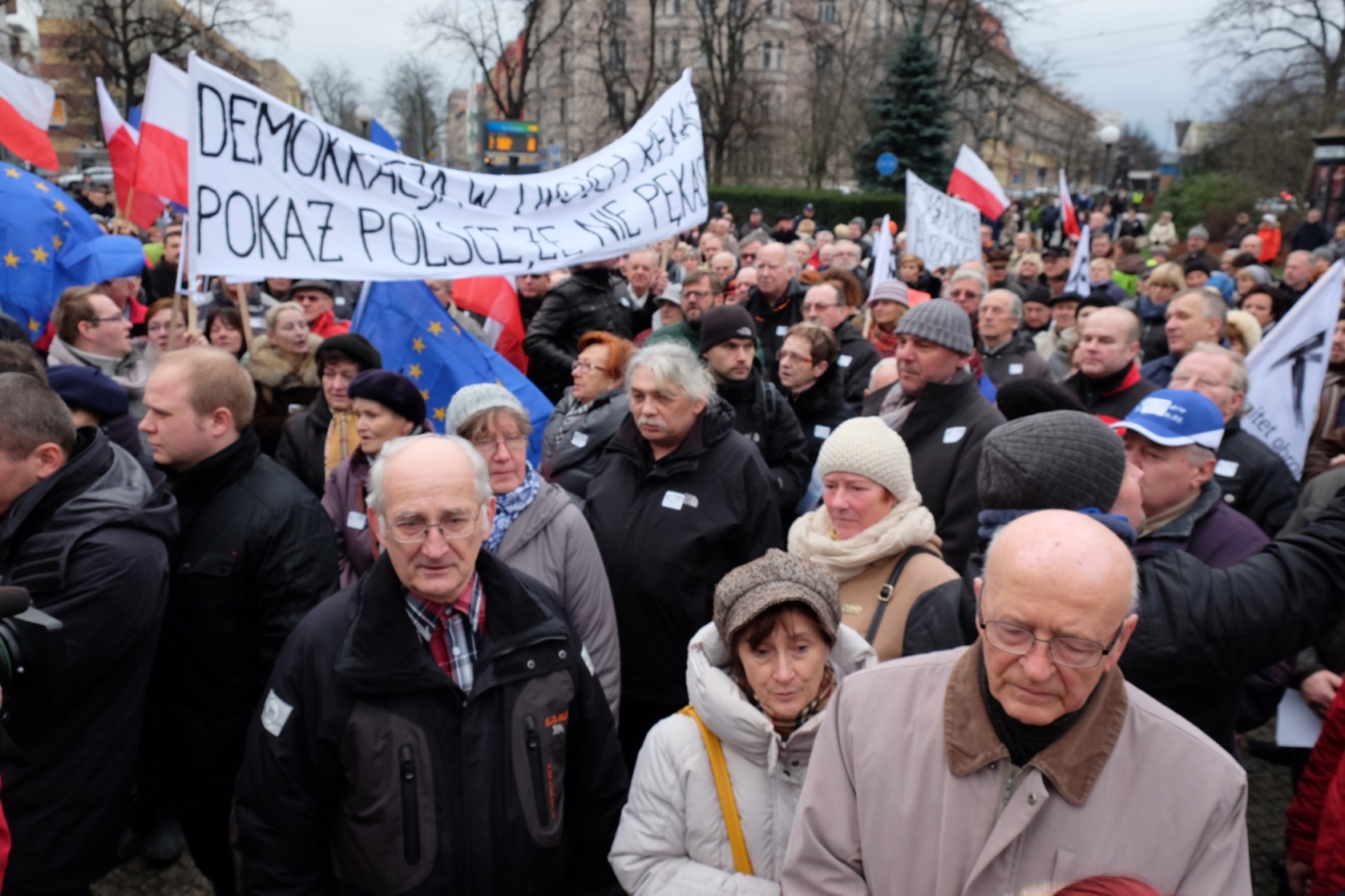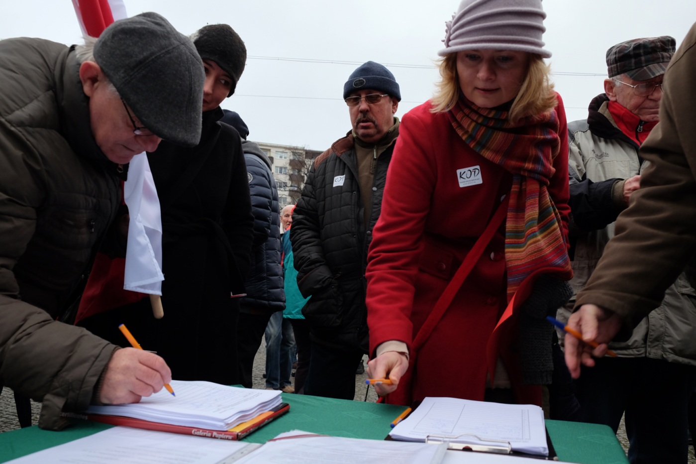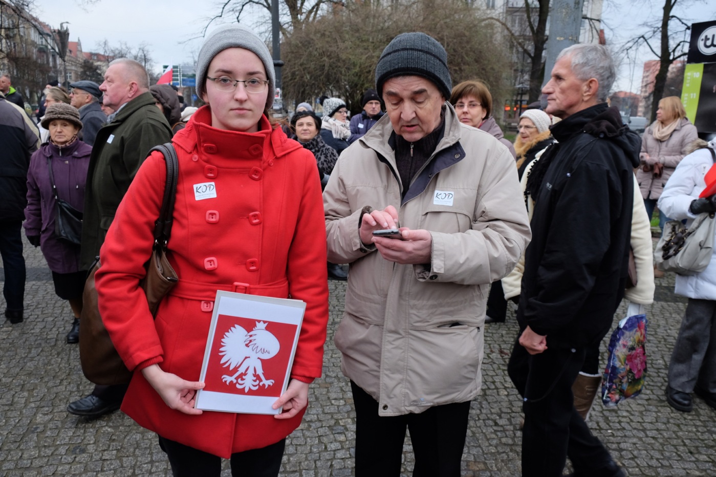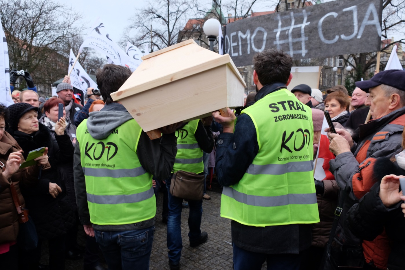 Kilkaset osób zebrało się w niedzielę (12.12.2015 r.) na pl. Grunwaldzkim w Szczecinie. Był to happening Komitetu Obrony Demokracji, który nie zgadza się z polityką rządu Prawa i Sprawiedliwości. W symbolicznej trumnie złożono Konstytucję RP.