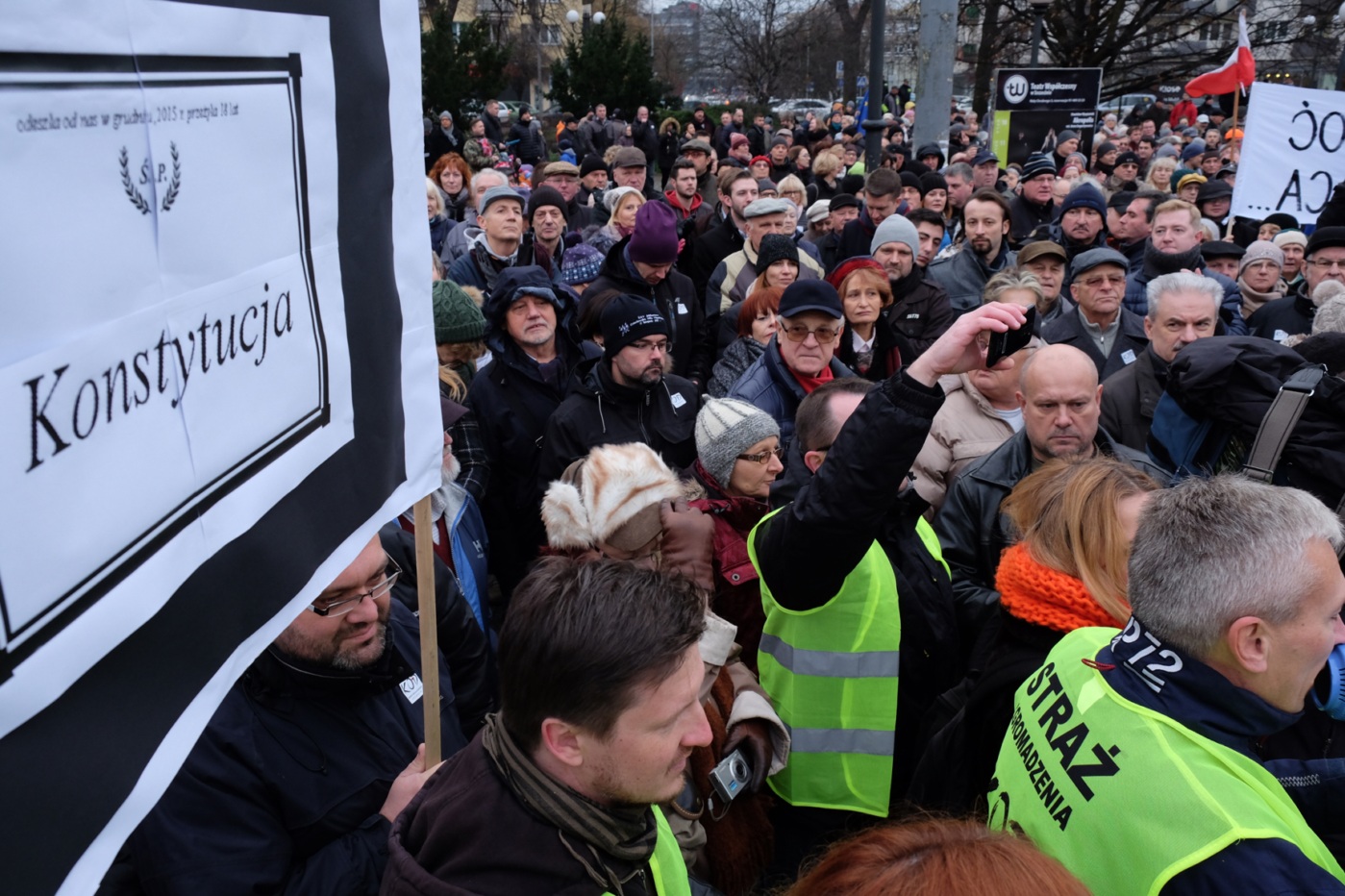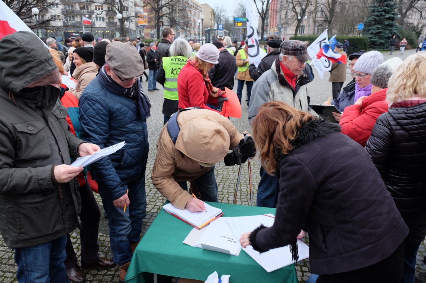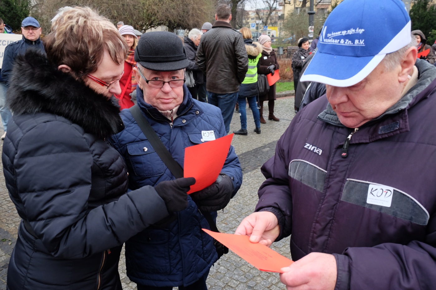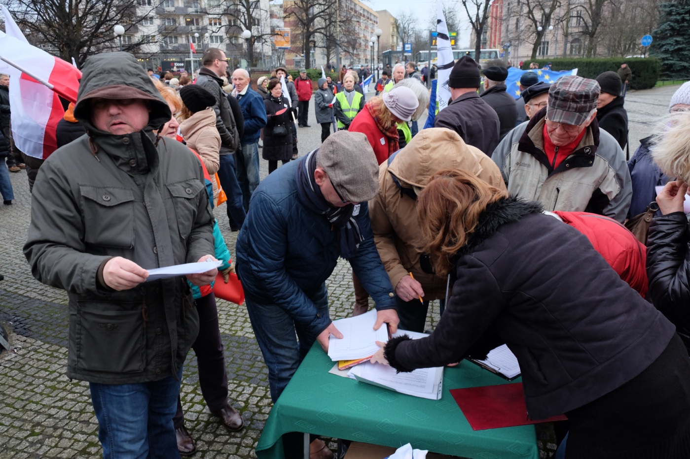 Kilkaset osób zebrało się w niedzielę (12.12.2015 r.) na pl. Grunwaldzkim w Szczecinie. Był to happening Komitetu Obrony Demokracji, który nie zgadza się z polityką rządu Prawa i Sprawiedliwości. W symbolicznej trumnie złożono Konstytucję RP.