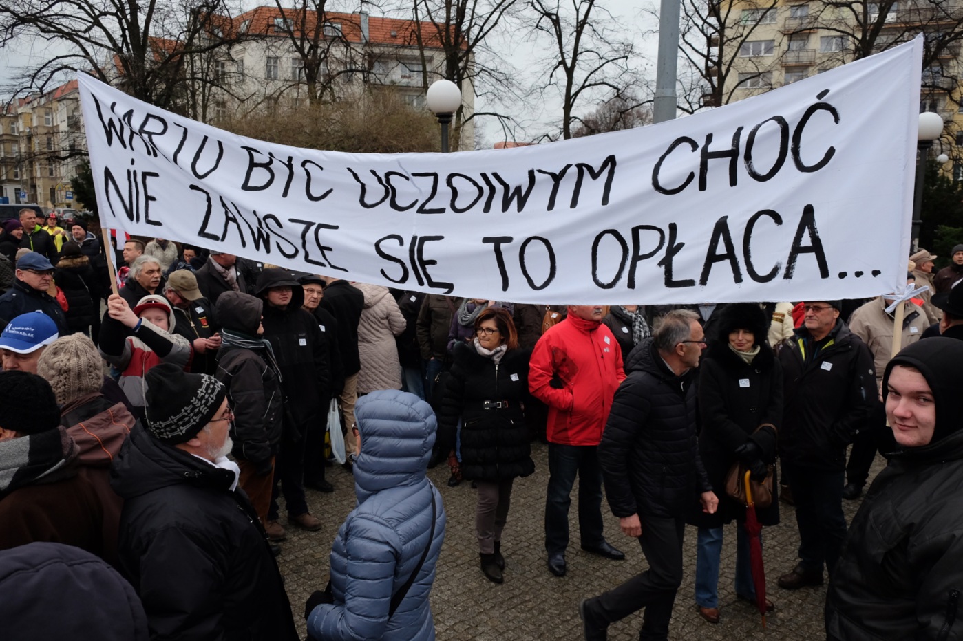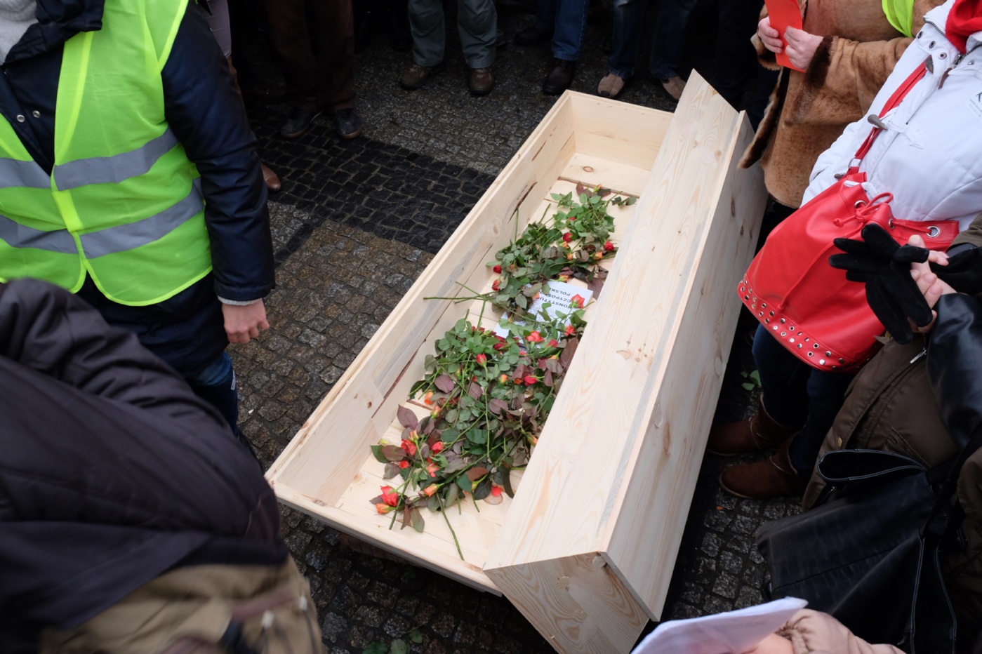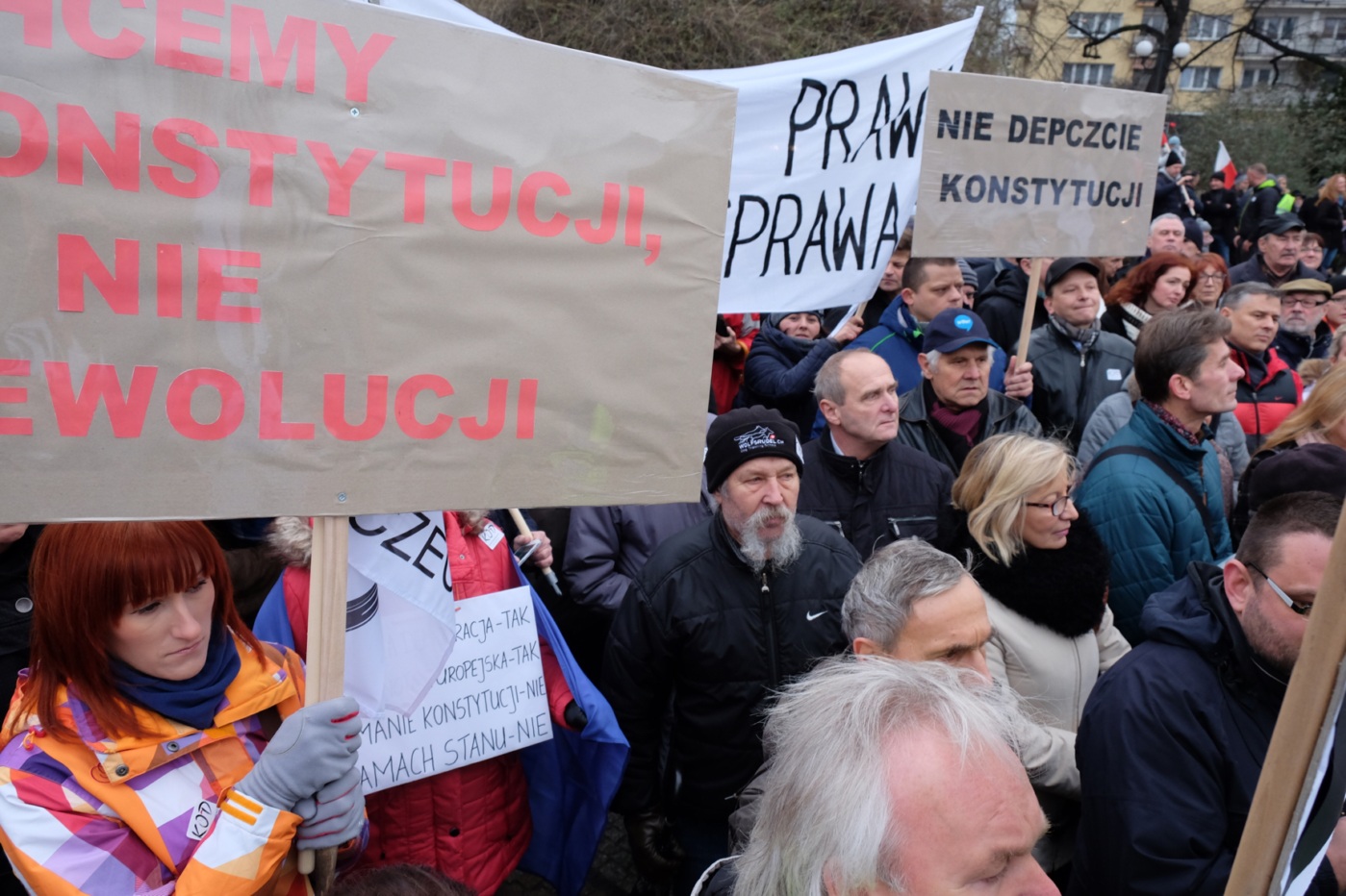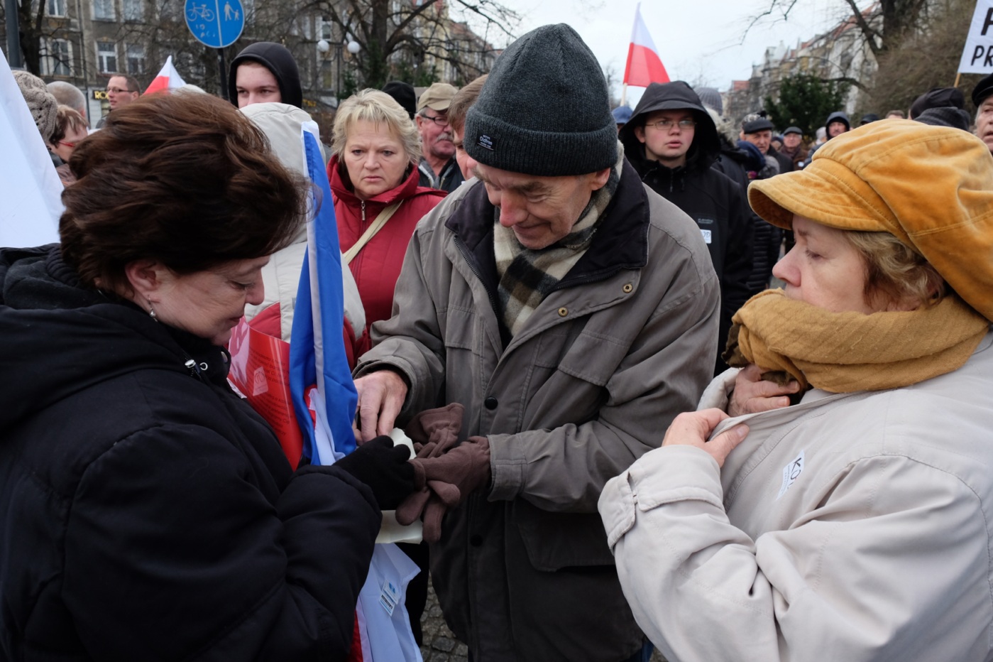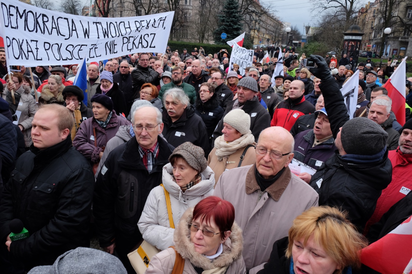 Kilkaset osób zebrało się w niedzielę (12.12.2015 r.) na pl. Grunwaldzkim w Szczecinie. Był to happening Komitetu Obrony Demokracji, który nie zgadza się z polityką rządu Prawa i Sprawiedliwości. W symbolicznej trumnie złożono Konstytucję RP.