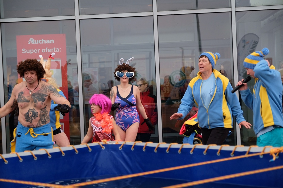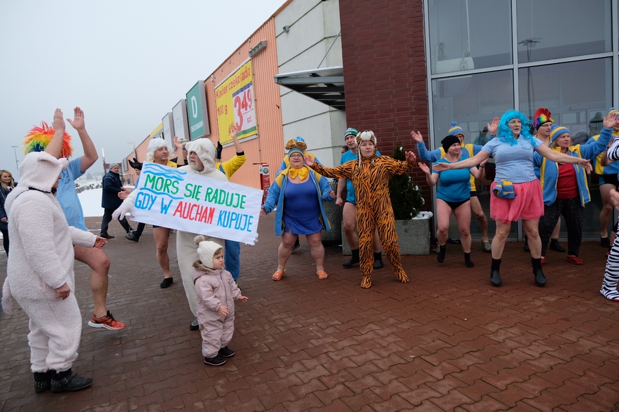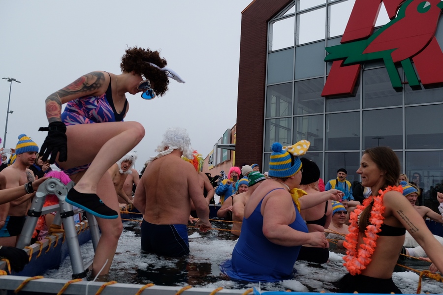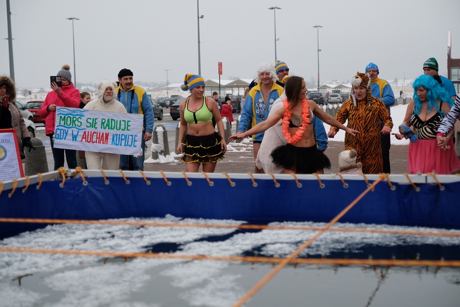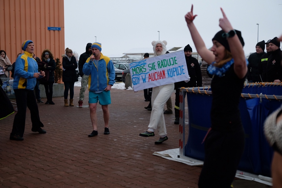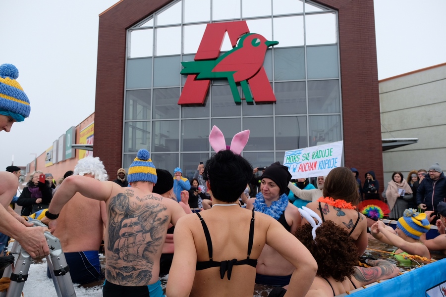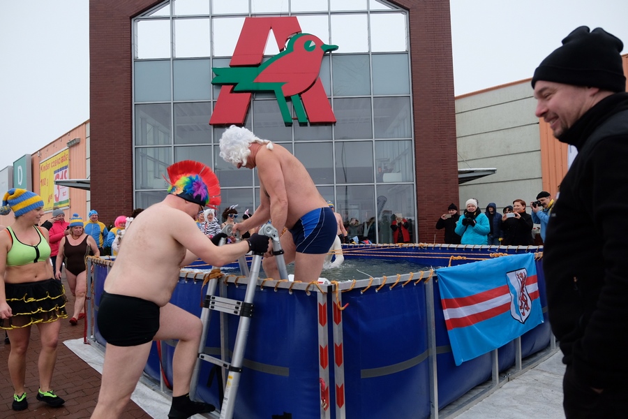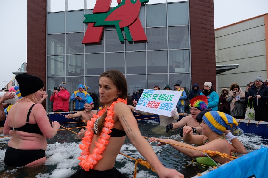 Kilkadziesiąt morsów spotkało się w niedzielę (4 lutego) przed Centrum Handlowym Auchan, aby wziąć udział we wspólnej kąpieli w basenie z lodowatą wodą. Jak widać po zdjęciach zabawa była znakomita.