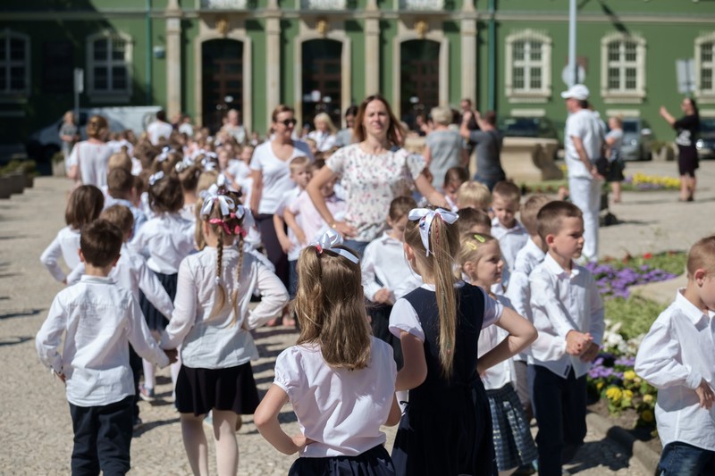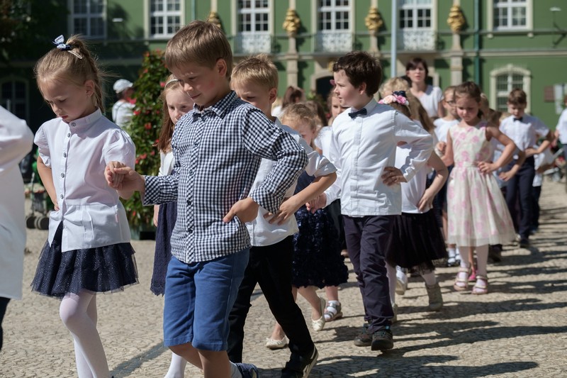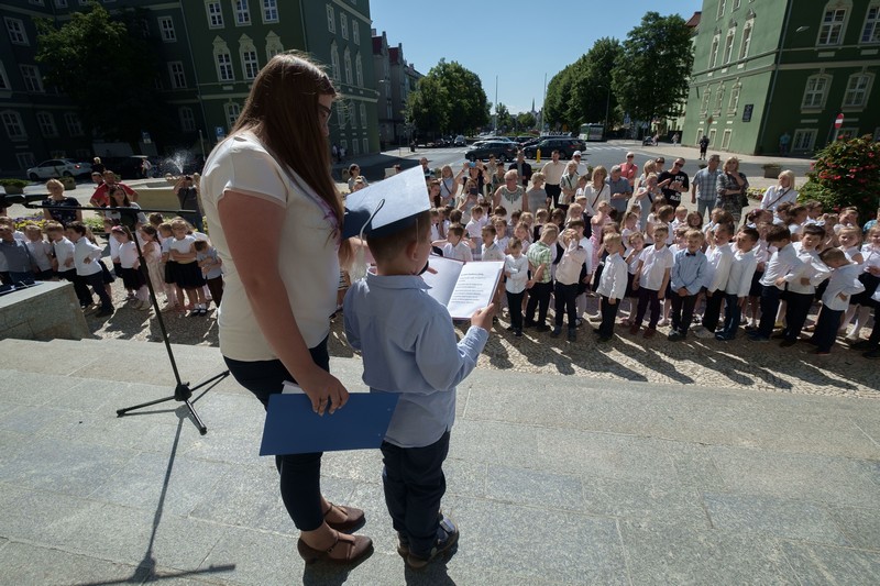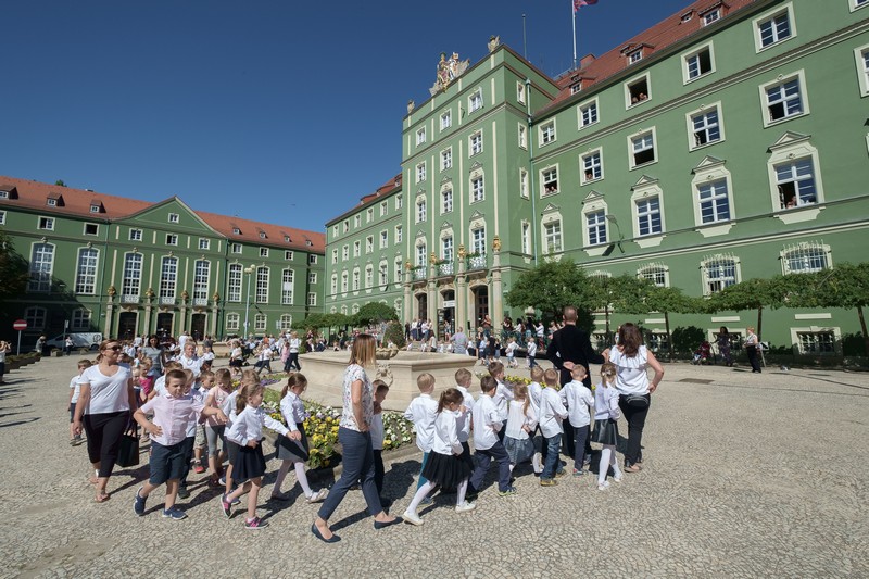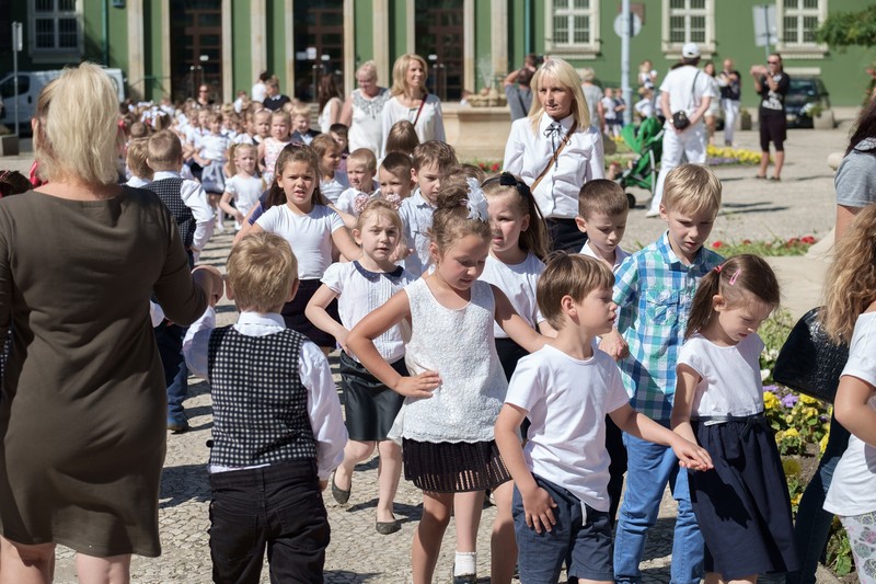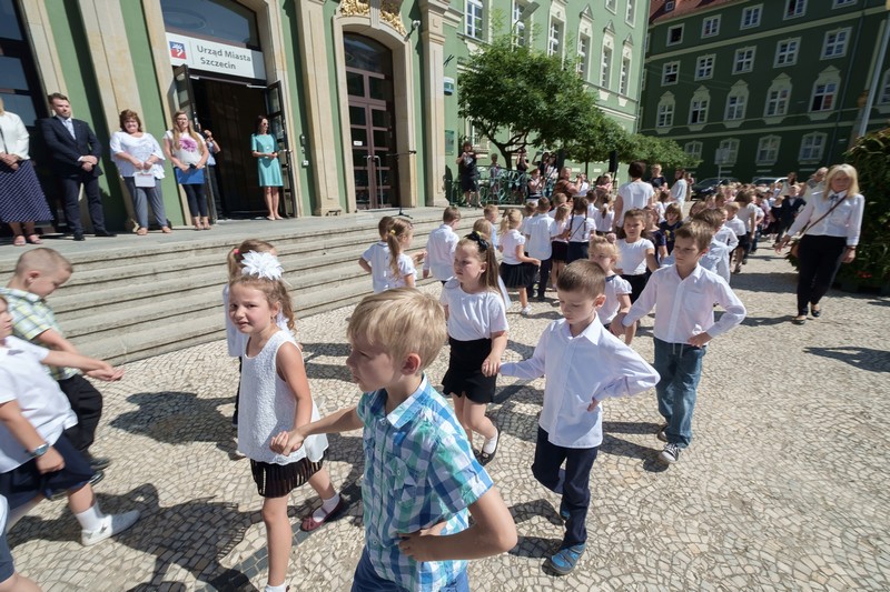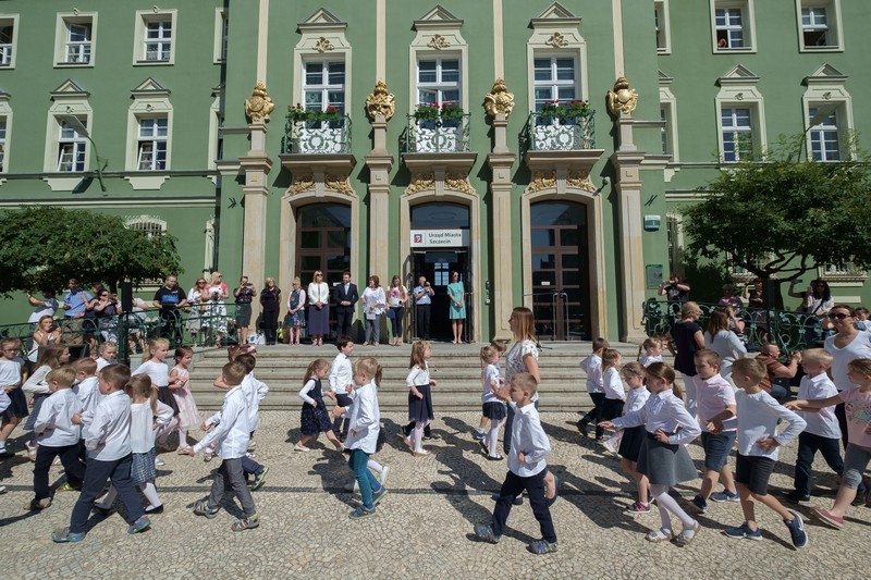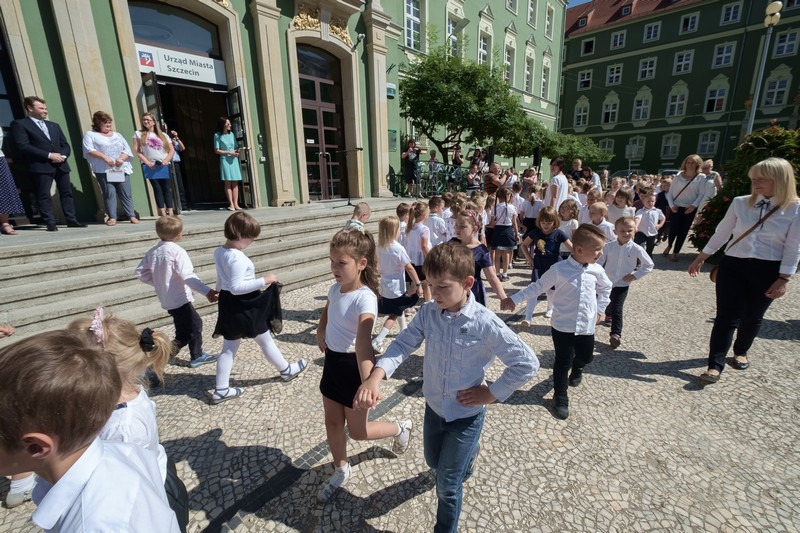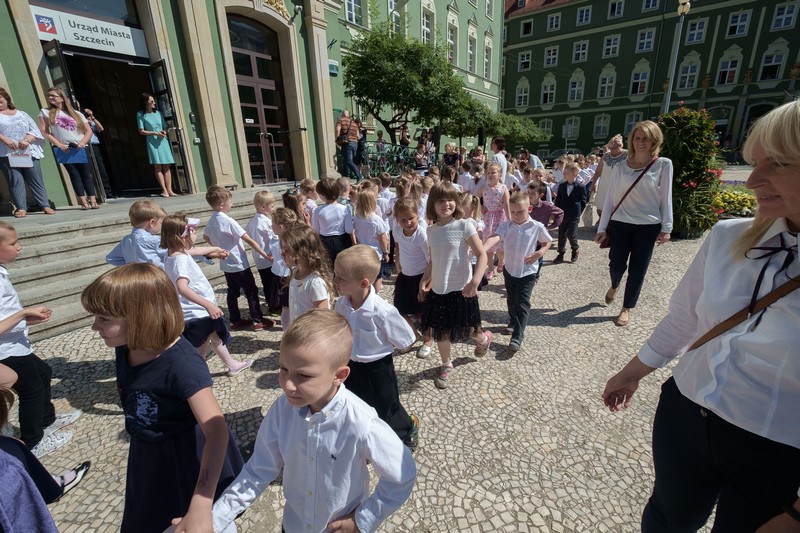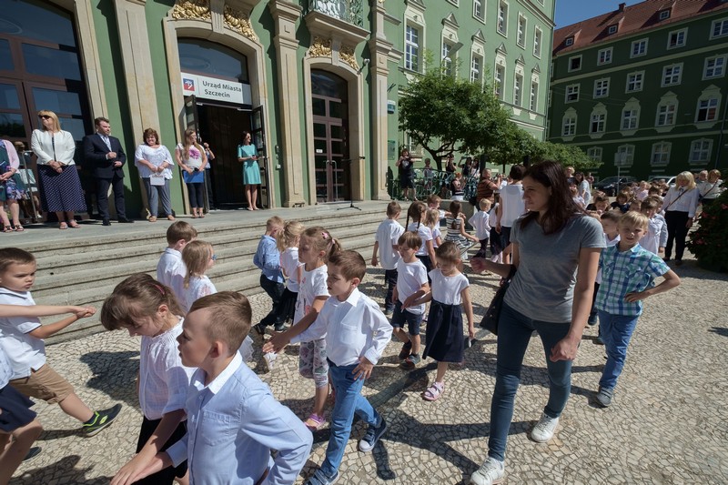 Przed szczecińskim Urzędem Miasta poloneza w środę 20 czerwca odtańczyły przedszkolaki z najstarszych grup. Była to coroczna ceremonia pn. „Pierwszy dzienniczek ucznia”. Fot. Dariusz Gorajski