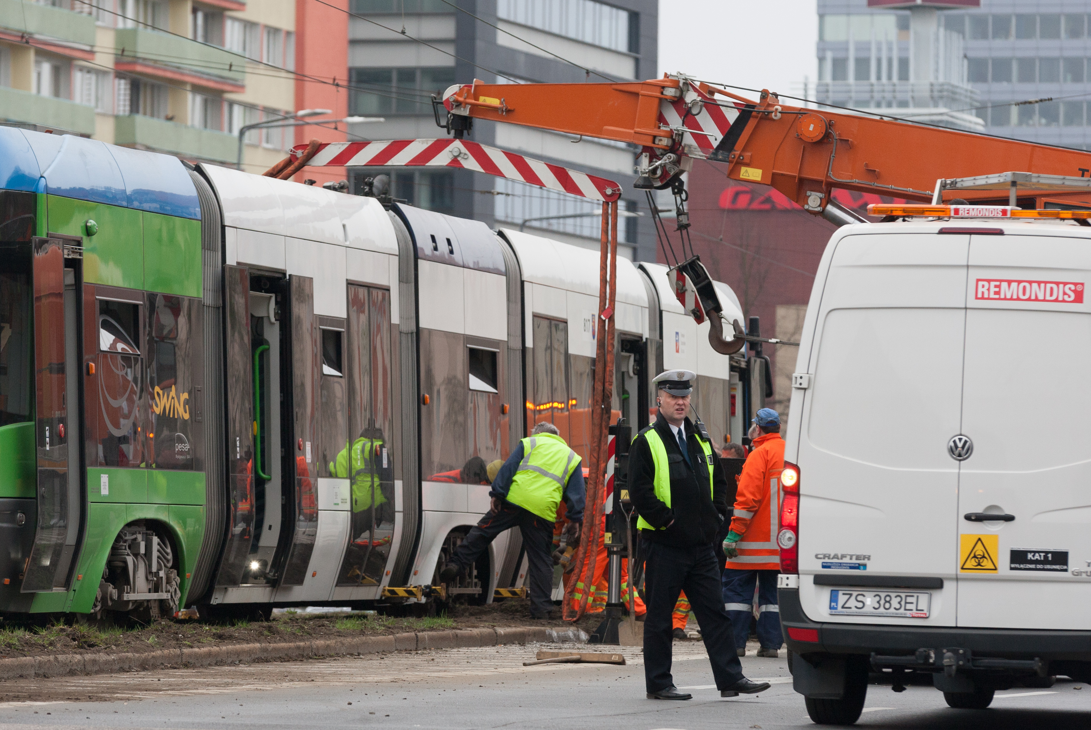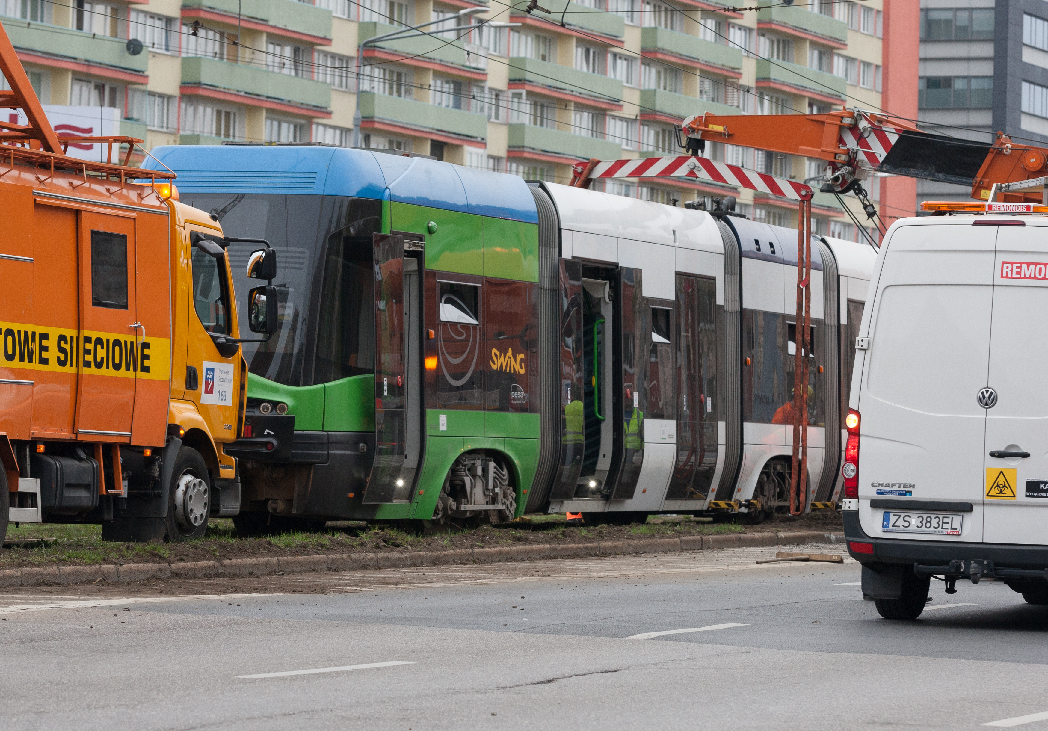 Do groźnie wyglądającego wykolejenia tramwaju typu Swing doszło w niedzielny poranek (10.04) na szczecińskim Niebuszewie. Przegubowy wago "wyskoczył" z szyn jednym ze środkowych wózków i kilkukrotnie powyginał się na przegubach. Dodatkowo połamał pantograf i zerwał sieć trakcyjną, co spowodowało kilkugodzinne kłopoty w kursowaniu linii obsługujących ten rejon miasta.