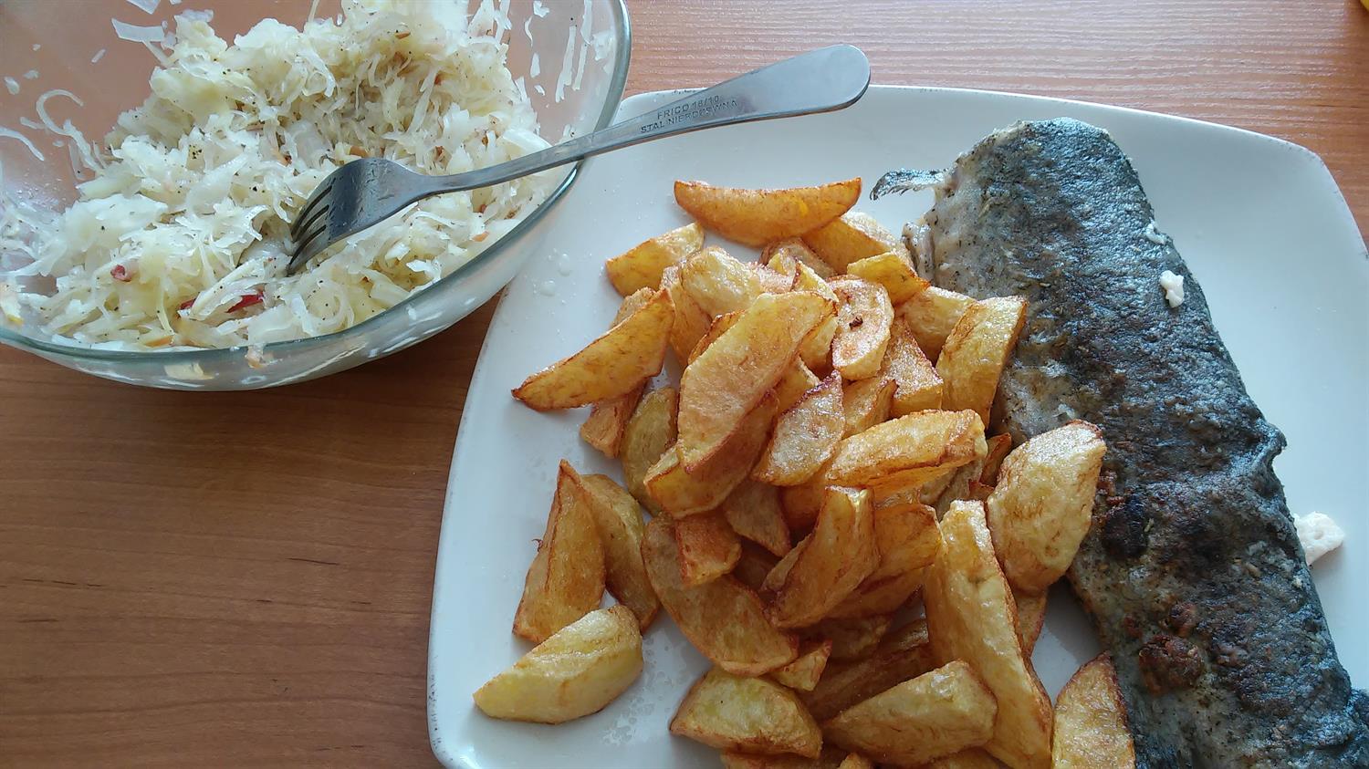Zaczynamy od przygotowania surówki. Niedużą garść kapusty kiszonej kładziemy na desce i kroimy. Dodajemy – według uznania – od połowy do jednego grubo startego jabłka (może być ze skórką). Jabłko i kapusta dadzą nam słodko-kwaśny dodatek do ryby. W ten sam sposób możemy dodać – choć niekoniecznie – trochę drobniej startej marchwi. W końcu dorzucamy nieco pokrojonej w kostkę cebuli lub krążków pora. Jeszcze szczypta pieprzu i całość mieszamy w salaterce, skrapiając obficie olejem (wzmacniacz smaku). Mamy też wersję z gotową surówką (dla leniwych) – kupioną w sklepie.