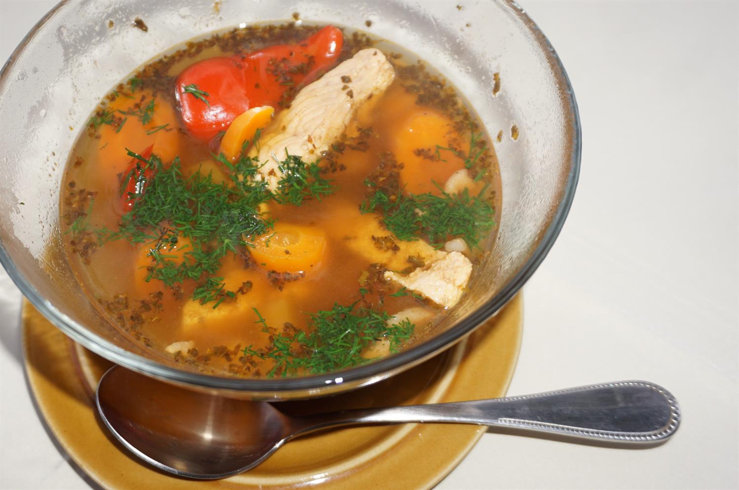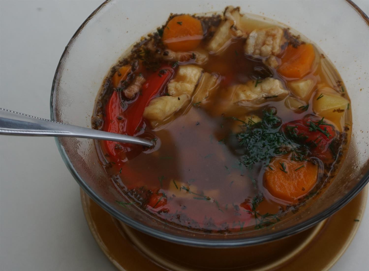 Kroimy marchewkę w talarki, ziemniaki i seler w kostkę, paprykę w krążki. Korzeń pietruszki natomiast kroimy na kilka większych kawałków. W ostrej papryczce robimy tylko otworki nożem, aby nie było za ostro. Smażymy boczek w niewielkiej ilości oleju. W garnku gotujemy 1,5 litra wody. Wrzucamy 2 listki laurowe i kilka ziaren ziela angielskiego oraz parę szczypt majeranku i 2-3 ząbki pokrojonego czosnku. Dodajemy też sos rybny i sojowy. Całość należy zagotować. Gdy w garnku wrze, wrzucamy pokrojone wcześniej marchew, pietruszkę i seler. Po jakimś czasie dodajemy pokrojone ziemniaki (żeby się nie rozgotowały). Gdy warzywa staną się półmiękkie, doprawiamy słodką i ostrą papryką mieloną.