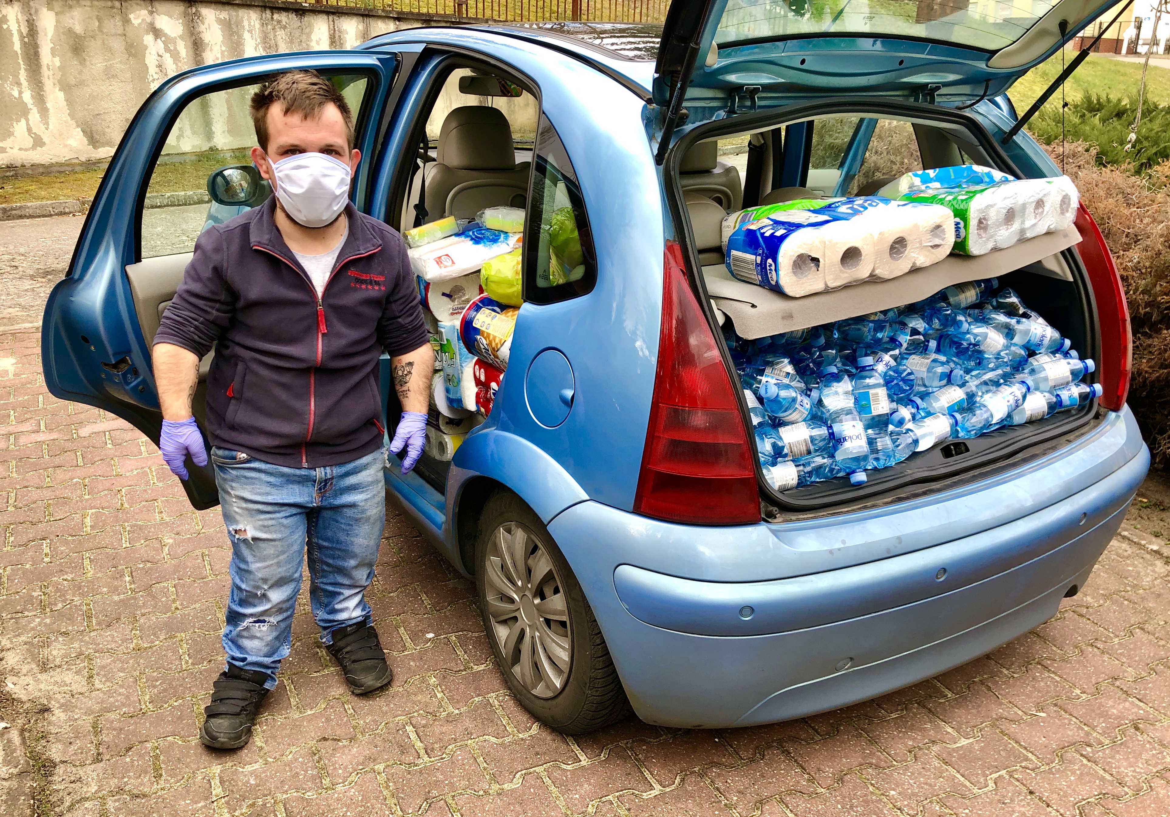 Pan Paweł w ramach akcji zbiera lokalnie produkty i towary dla pacjentów ze szpitali w regionie.