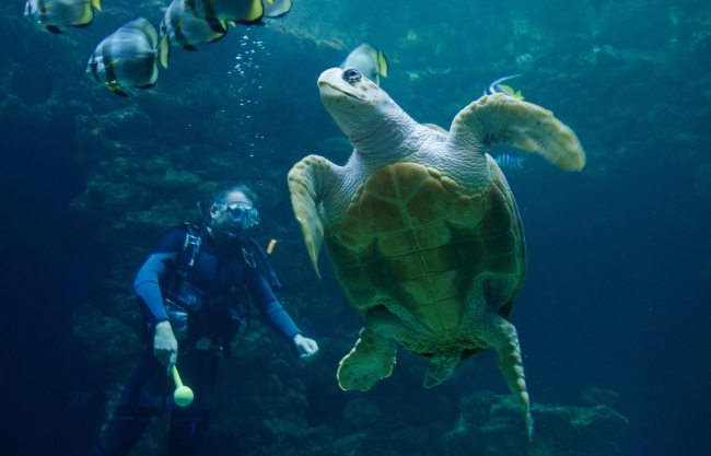 Żółwica z oceanarium w Stralsundzie w Niemczech obchodziła ostatnio swoje 50. urodziny. W akwarium, które ma pojemność 350 tysięcy litrów, czekała na nią niespodzianka. W dniu swojego święta otrzymała od opiekunów tort z kalmarów i mintaja.