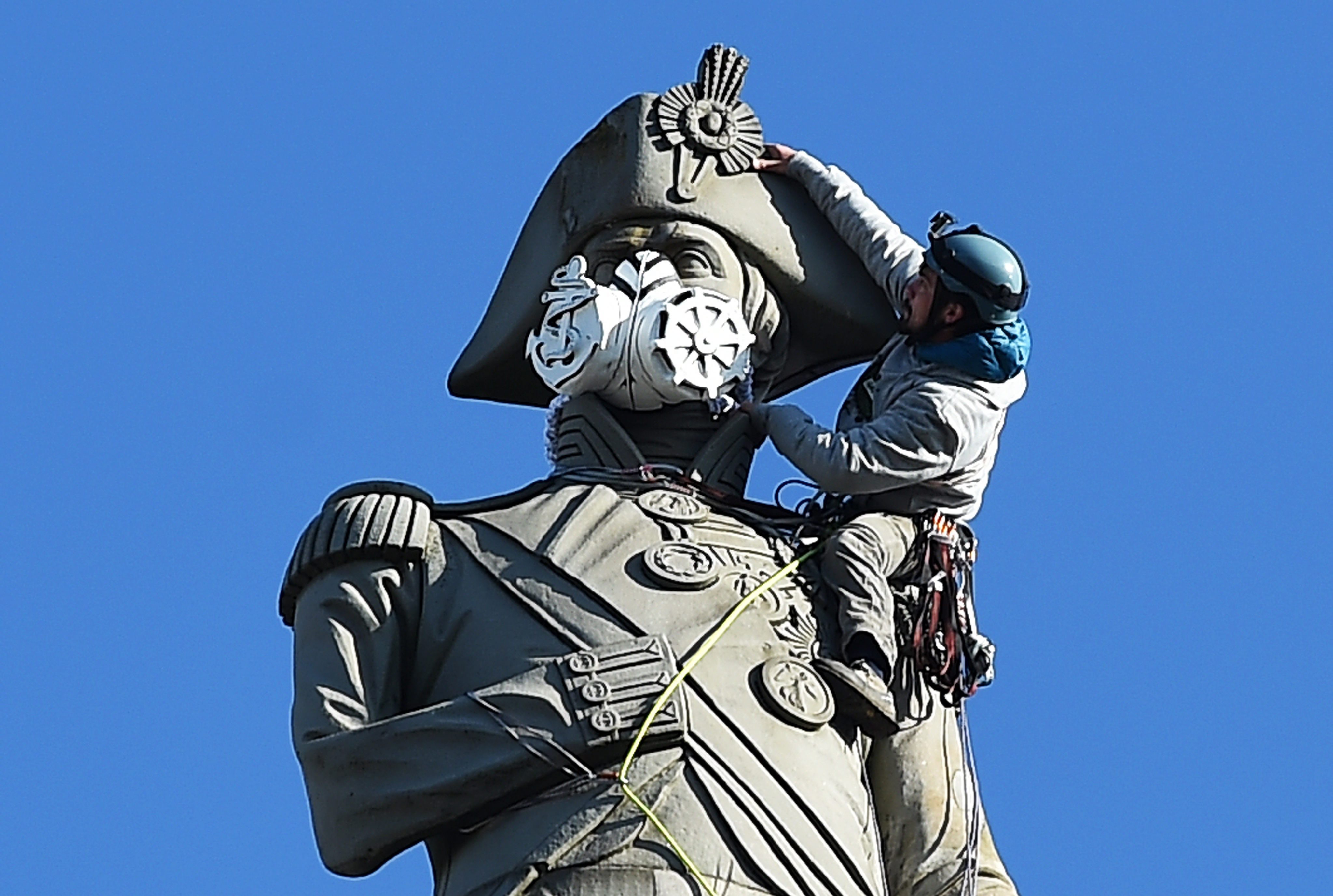 Działacze Greenpeace’u pozakładali w poniedziałek w Londynie posągom maski przeciwgazowe w ramach kampanii o czystsze powietrze. W maskę ubrano nawet najsłynniejszego admirała brytyjskiej floty Horatio Nelsona na ponadpięćdziesięciometrowej kolumnie na Trafalgar Square.