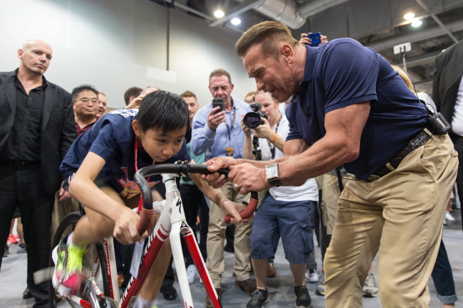 Arnold Schwarzenegger amerykański aktor i były gubernator Kalifornii ma swój festiwal w Chinach. Impreza poświęcona jest pierwszej pasji Austriaka z pochodzenia - fitnessowi. Od 20 do 21 sierpnia, w Hongkongu kilkudziesięciu sportowców testuje swoje możliwości w tak różnych dyscyplinach jak jazda na stacjonarnym rowerze, wyścigach na ergonometrach, crosfit, zawodach strongmenów, a nawet szachach. Na zdjęciu Schwarzenegger dopinguje jednego z młodych uczestników konkursu rowerowego.