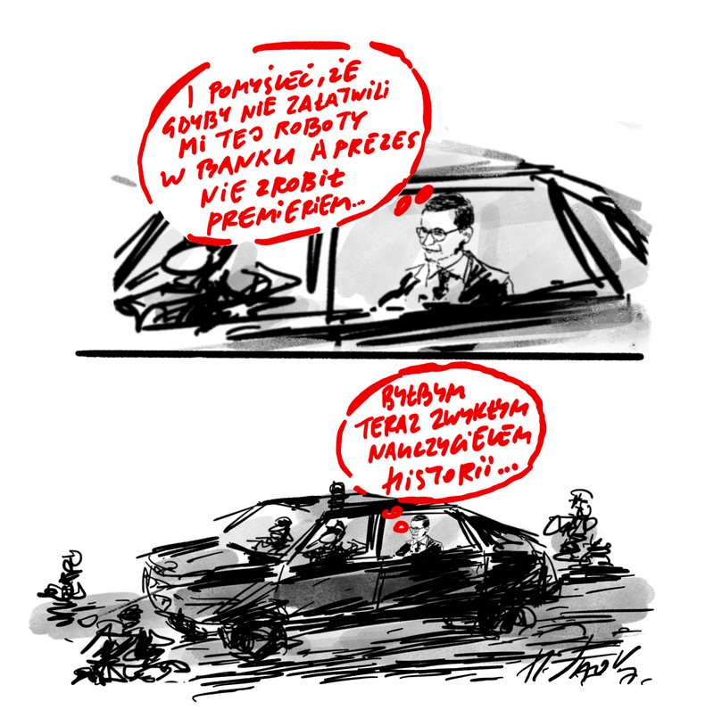 Są humory białe i czarne. Ten należy do smutnych. W czarnej limuzynie pod eskortą zza niezaczernionych szyb wizerunek Premiera Najjaśniejszej. Premier jak w zamkniętej klatce, gryzący się ze swoimi myślami. Doszedł już do tego stanu,że zazdrości skromnemu na niewielkiej pensji nauczycielowi historii , ale z poczuciem godności, (sam jest z wykształcenia między innymi historykiem i mógłby nim być) niż być zakładnikiem decyzji od obcych o charakterze materialnym. Na nic wielkie pieniądze dyrektora banku, wielkie pieniądze za bycie premierem Najjaśniejszej i bycie chłopcem na posyłki, jakiegoś prezia, a swoją twarzą zakrywać wszelkie wpadki, od przypadku, do wypadku. W takich czasach przyszło nam żyć w Najjaśniejszej RP.