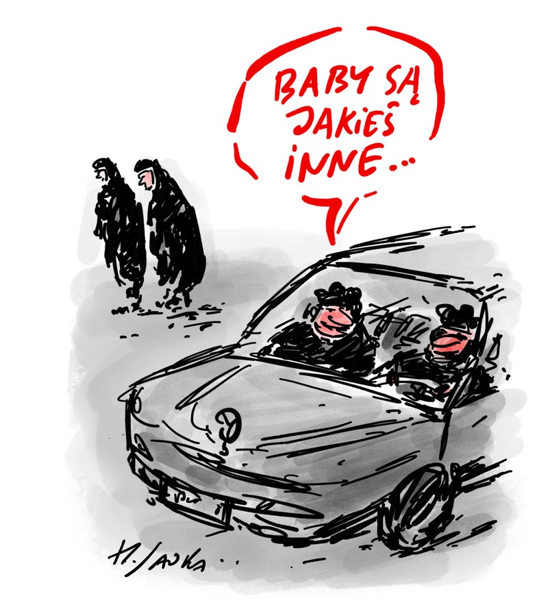 Te panie (na rysunku) to zakonnice, raczej nie muzułmanki w czadorach. Księżulkom "robijającym" się w wielkich, drogich furach wydają się dziwne - one służą Bogu, a oni tyko z tej służby (na tej służbie) korzystają.