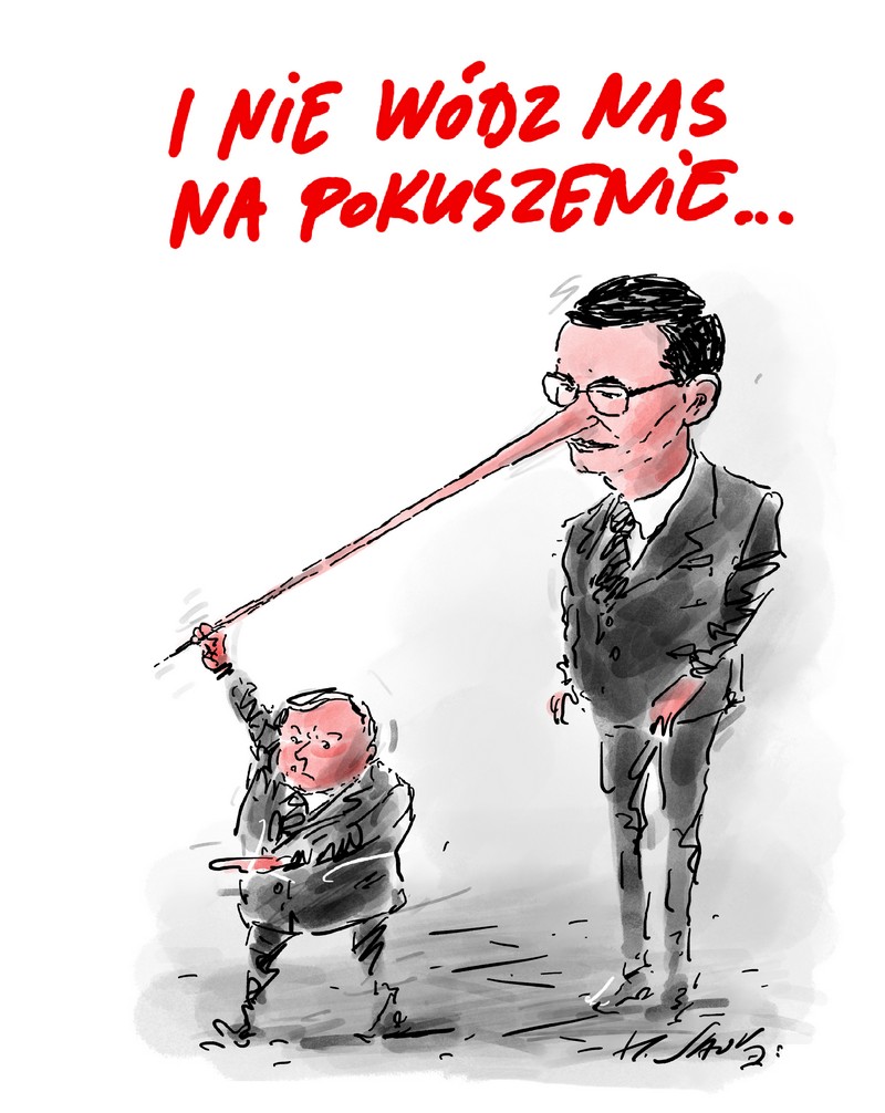 To smutny, zgryźliwy humor, ale humor. Pięknie wykorzystany fakt podobnego brzmienia, słów, "Wódz" i wódź". Człowieka przywykłego do nałogowego kłamstwa, symbolizuje długi nos jak w dziecięcej bajce o Pinokiu. Im dłuższy nos , tym łatwiej nawet karzełkowi wodzić za nos "takiego wielkiego premiera a za tym i rząd" Najjaśniejszej. Śmieszne i groźne. Gęby międlące o przywiązaniu do korzeni chrześcijaństwa tym samym i do dekalogu, są tyko pustosłowie, a zakłamany ludek boży,o mentalności żebraczej cieszy się że "One daju"!