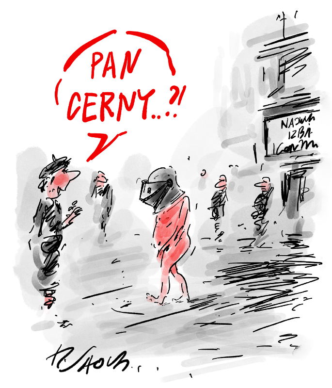 To bardzo sugestywny humor. Długo rozmyślałem, aż..... dostrzegłem za wyrazem "cerny.." dwie dyskretne kropki. To znaczy dopisz, domyśl się co tam pasuje. Czyli wyszło na to, że "kobicinka" z berecikiem z antenką, coś gdzieś usłyszała, "pancerny Marian.". Ludek wychodzący z biura NIK-u, to ludzik z zakutym łbem. Odporny na ciosy w głowę, ale jednocześnie ostentacyjnie demonstruje; Nie mam nic do ukrycia, tylko mogę więcej odsłonić. W oddali widać trzech "smutnych panów".