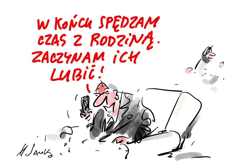 Humor składa się z czterech części. Jak na załączonym obrazku.1)Graficznie widzimy rozmemłanego zadowolonego z siebie, wypasionego prezesa,zasiadającego w wygodnym fotelu -leniwcu. Pozornie trzyma niby komórkę i z niby kimś rozmawia. 2)U góry z prawej strony efemeryczny rysunek, ledwo rozpoznawalny.namiastka wizerunku rodziny mamuśka z dwoma buźkami bobasów. Ale To jest tylko wspomnienie o rodzinie. Czas przeszły. 3)Odnośnie "W końcu spędzam czas z rodziną", to odpowiedź , dla tych , którzy zarzucają prezesowi, że jest "przepracowany" i nie spędza czasu w domu (z rodziną). Intrygujący jest szczegół. Ten prezes nie trzyma w ręku komórki. On trzyma pułapkę na myszy. I tym szczegółem przechodzimy do części 4) "Zaczynam ich lubić". To dyspozycyjni rządzący i kandydaci do foteli którzy są wabieni na spyrkę, na "Posady", jak łapanie szczurów. I takich w "rodzinie" zaczyna lubić.