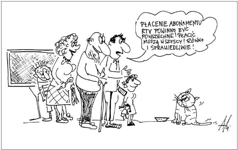 A wlasnie ze NIE wszyscy. Emeryci sa zwolnieni z placenia!!!!! Czy to jest rownio i sprawiedliwie?????? Najlepiej to by bylo aby w aparat TV wkomponowano: puszke na forse i dluga ruuure - az do Warszawy tj. tam skad nadaja, ktora datki by leciaaaaaly. A program bylby nadawany z epoki lat Edyty i Krychy Loski.A gole strzelai-by Zigi, Wlodo, I oczywiscie Tomek (bo on tez strzelal - Nie tylko bronil). Ale to byly czaaaaaaaaaaasy, ulice zamieraly, ryki dochodzily z blokowisk....... I to wszystko bylo POWSZECHNE. O.