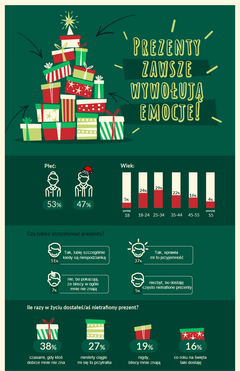 Spośród 1337 zapytanych Polaków, 16% deklaruje, że co roku taki dostaje na święta, a 27% potwierdza, iż niestety ciągle im się to przytrafia. 38% mówi, że czasami, gdy ktoś ich dobrze nie zna. Tylko 19% jest upominkowymi szczęściarzami, którzy otrzymuje pożądane prezenty.
