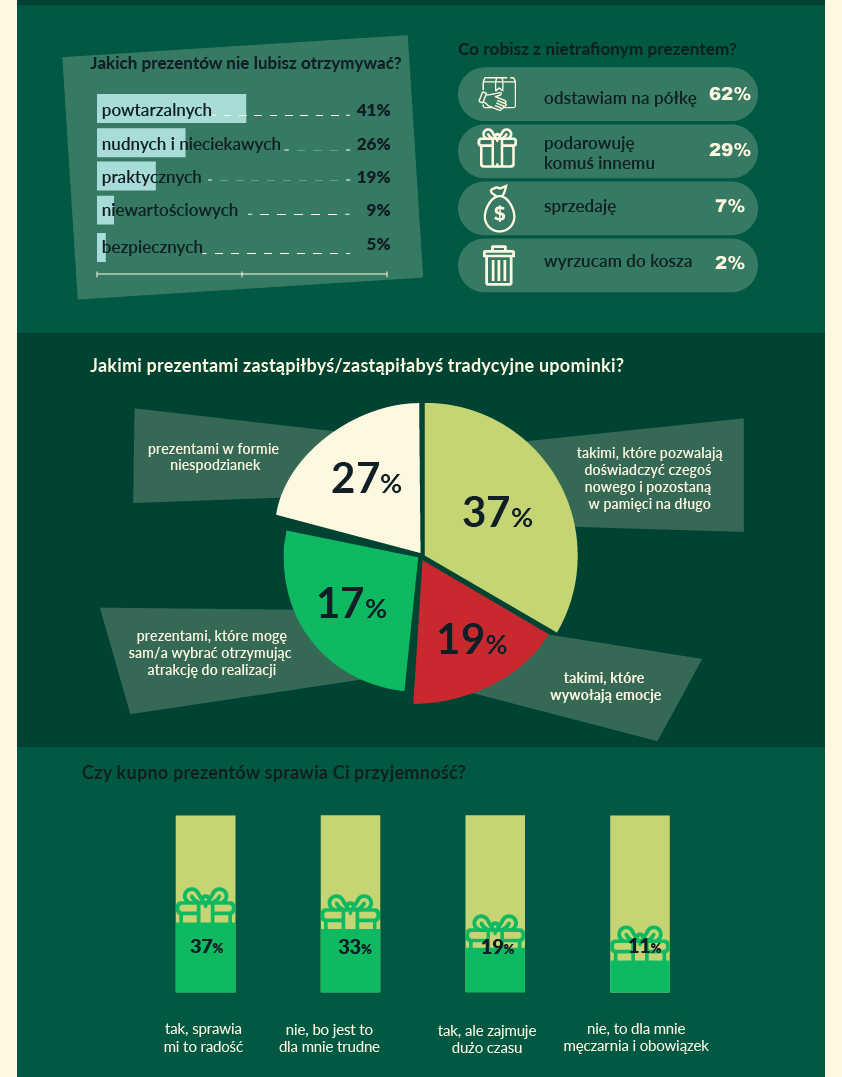 Aż 62% zapytanych Polaków odstawia nietrafiony prezent na półkę, a 29% podarowuje go komuś innemu. 7% sprzedaje go, a 2% przyznaje otwarcie, iż po prostu wyrzuca do kosza. Zapytani respondenci mówią wprost, że nie lubią otrzymywać upominków powtarzalnych (41% wskazań), nudnych i nieciekawych (26% wskazań) oraz praktycznych (19% wskazań).