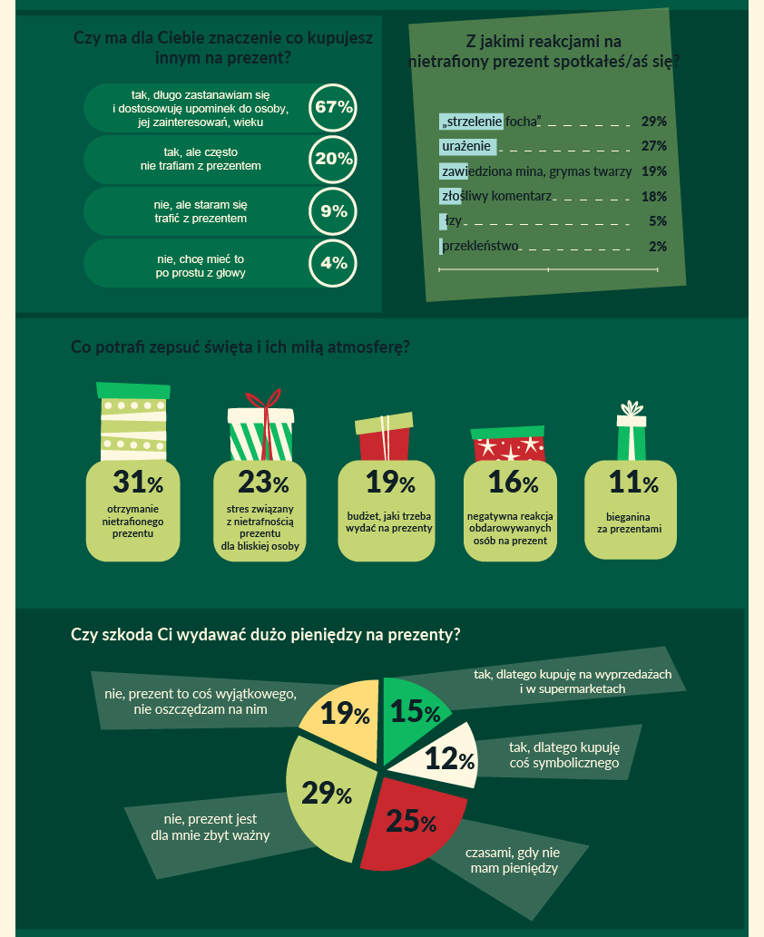 Zakup świątecznych podarunków nie jest wcale łatwym zadaniem. Spośród 1337 zapytanych Polaków jedynie 37% potrafi powiedzieć, iż sprawia im to przyjemność, ale 33% deklaruje, iż nie lubi tego robić, gdyż kupno prezentów sprawia im trudność. A 11% przyznaje otwarcie, że jest to dla nich męczarnia i obowiązek.