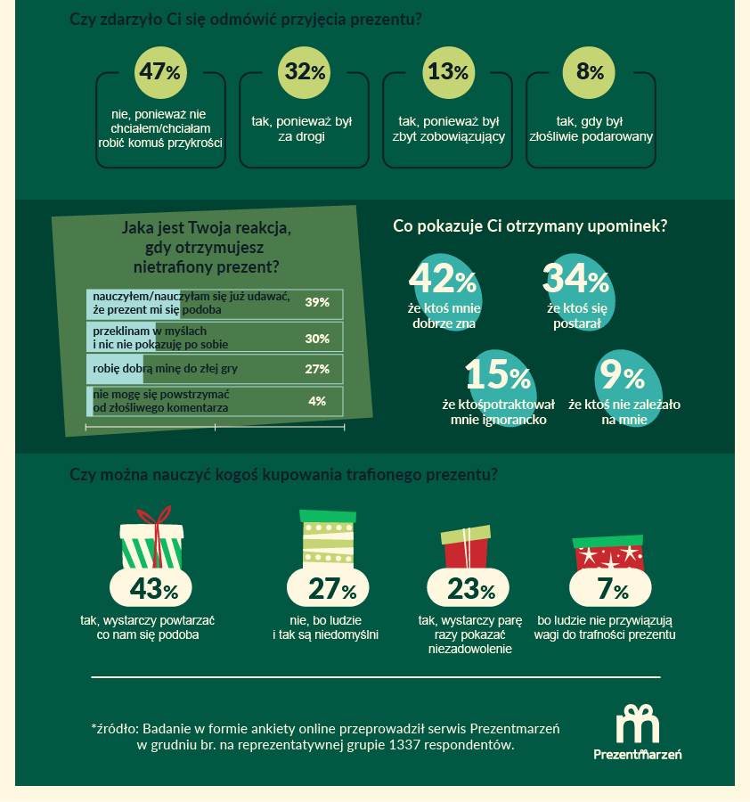 Pomimo wszystko lubimy otrzymywać prezenty, szczególnie kiedy są niespodzianką – potwierdza to 51% osób. Uważamy również, że można nauczyć bliskich kupowania prezentów poprzez powtarzanie co nam się podoba – tak twierdzi 43% ankietowanych. Rzadko kto odmawia przyjęcia prezentu, ponieważ nie chcemy robić komuś przykrości (47%), ale zdarzają się takie sytuację gdy uważamy, że prezent jest za drogi (32%) lub zbyt zobowiązujący (13%) i wtedy mówimy nie.