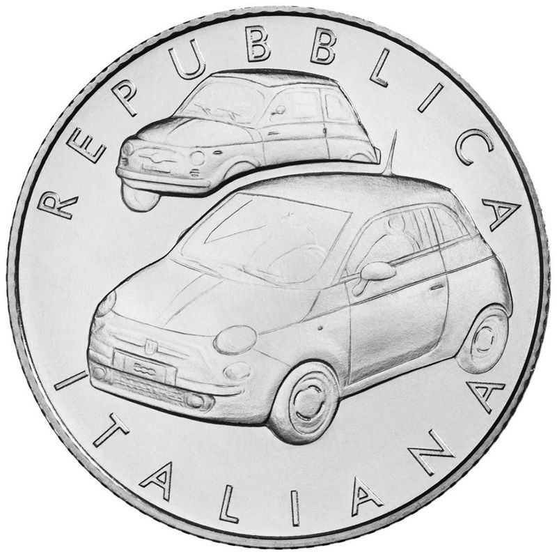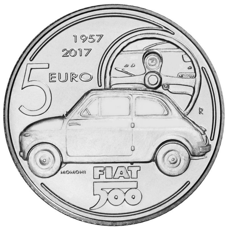 Mennica Włoska wyemitowała nową, limitowaną monetę dla uczczenia kultowego modelu Fiat 500, który obchodził w tym roku swoje 60. urodziny. Srebrne 5 euro ma nakład zaledwie 4000 sztuk „niebędących w obiegu". Mennica sprzedaje je za 40 euro. Monetę zaprojektowała Claudia Momoni.