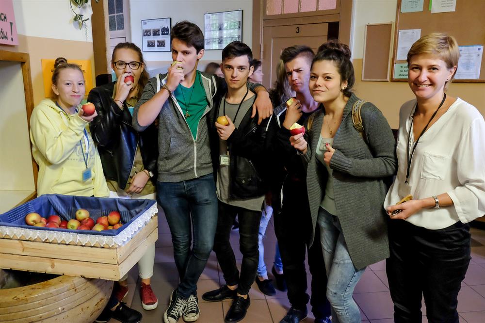 Uczniowie VI Liceum Ogólnokształcącego w Szczecinie jedzą w swojej szkole jabłka. I nie byłoby w tym nic dziwnego gdyby nie fakt, że otrzymują je za darmo trzy razy w tygodniu. Zakup owoców finansuje rada rodziców, dzięki czemu na lekcyjnych przerwach w poniedziałki, środy i piątki pojawia się na korytarzu skrzynka z jabłkami. Poczęstować może się każdy. Akcja ruszyła w ubiegłym roku szkolnym w odpowiedzi na nałożenie przez Rosję embarga na polskie jabłka. Inicjatorami i realizatorami nowej tradycji w "szóstce" są nauczyciele: biologii Monika Łuczak i WOS Dariusz Okoń. - Zaczęło się od wydarzenia społeczno-politycznego, a dziś akcja, która służy promocji zdrowego stylu życia stała się tradycją naszej szkoły. Cieszy się tak olbrzymią popularnością, że planujemy ją w przyszłości rozszerzyć - dodaje nauczycielka biologii. (el)