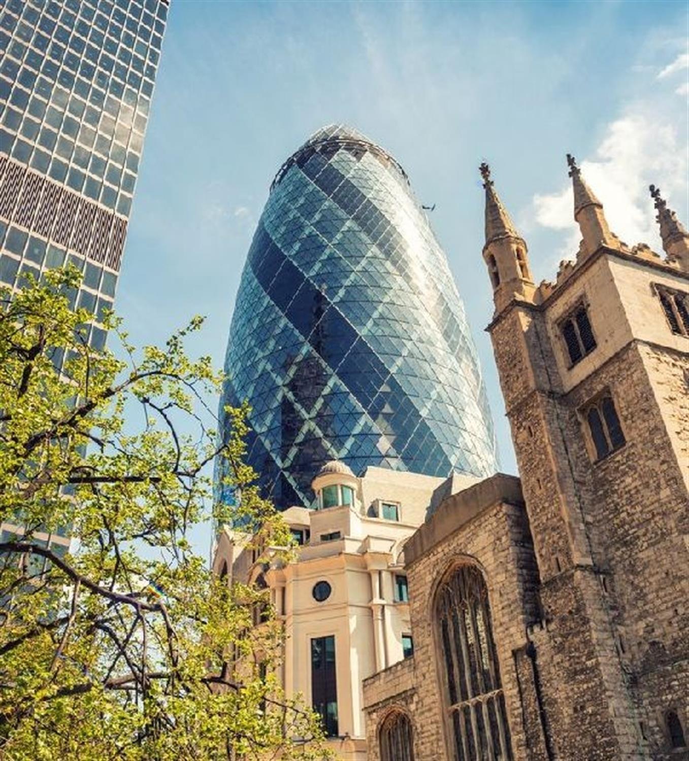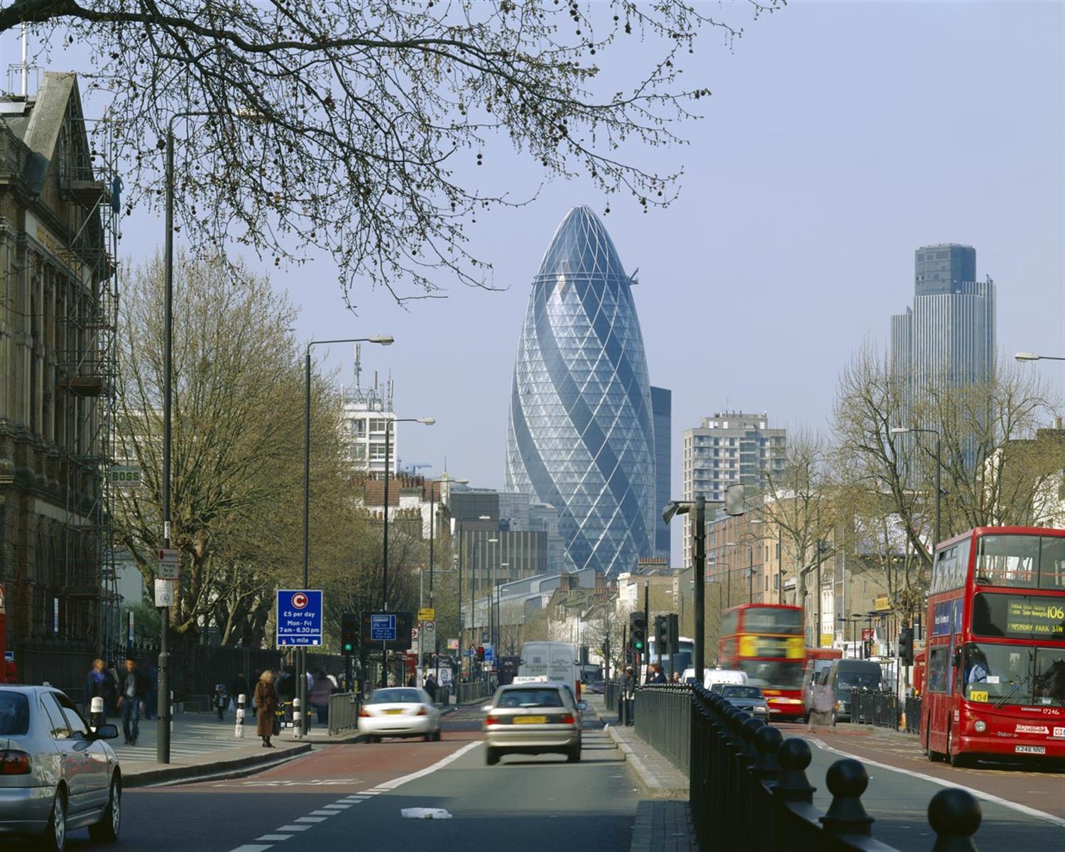 Dziełem Fostera jest również biurowiec 30 St Mary Axe w Londynie. Tym razem budynek został wyciągnięty do góry i ma aż 180 m wysokości. Wieżowiec – zwany Swiss Re bądź Gherkin – także jest budynkiem ekologicznym. Podwójna szklana tafla elewacji chroni wnętrza zarówno przed zbytnim nagrzewaniem, jak i zapewnia izolację.