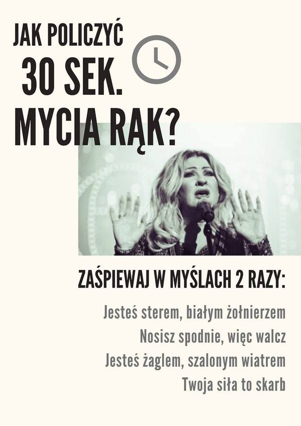 Od kilku dni po internecie krąży plakat z rekomendacją o śpiewającym myciu rąk: "Jak policzyć 30 sekund mycia rąk? Zaśpiewaj w myślach dwa razy: "Jesteś sterem, białym żołnierzem, nosisz spodnie, więc walcz. Jesteś żaglem, szalonym wiatrem, Twoja siła to skarb".