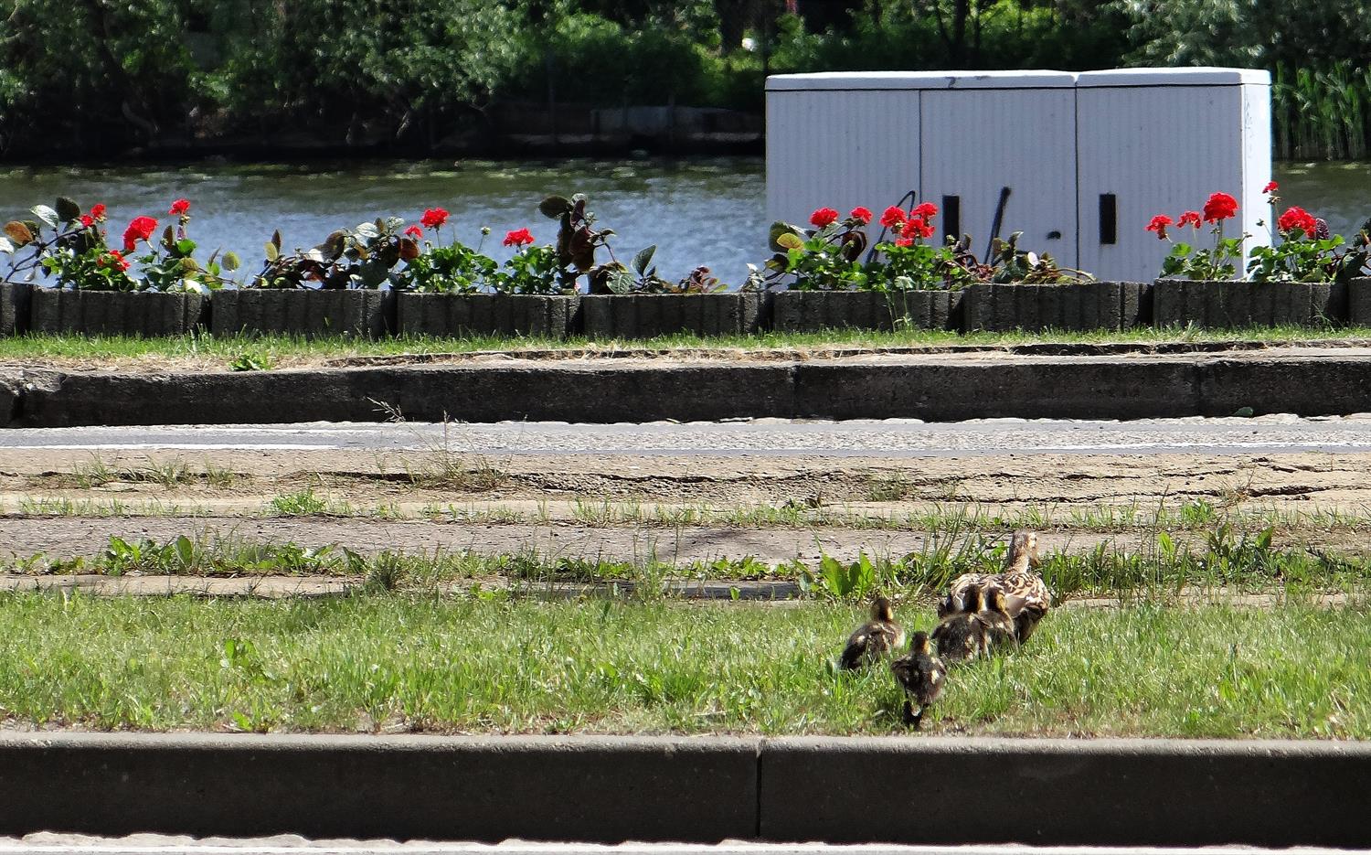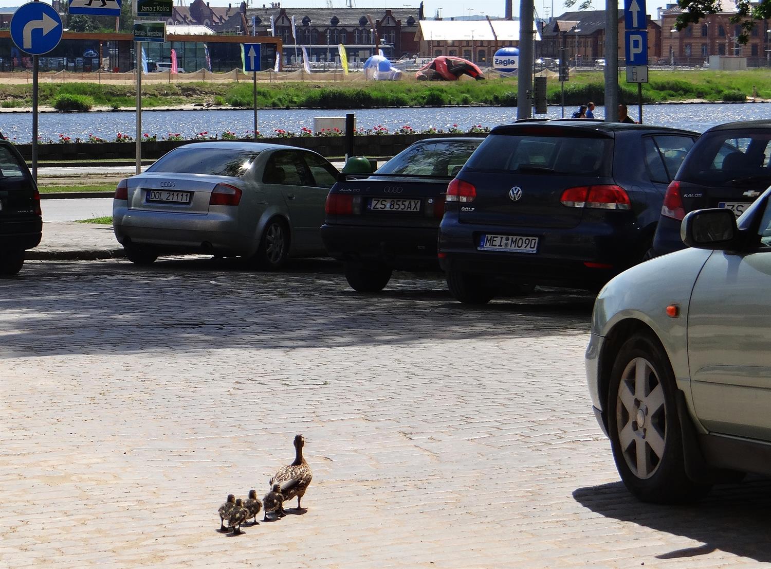 Do dzików grasujących po szczecińskich osiedlach jedni zdążyli się już przyzwyczaić, inni nie. W zurbanizowanej przestrzeni miejskiej próbują też odnaleźć się INNE zwierzęta. Tak jak ta - widoczna na zdjęciach - gromadka młodych kaczek krzyżówek z mamą-przewodniczką na ruchliwych ulicach Szczecina.