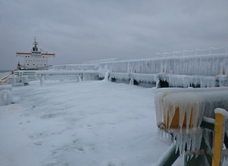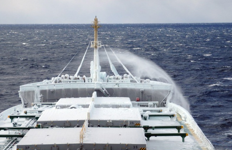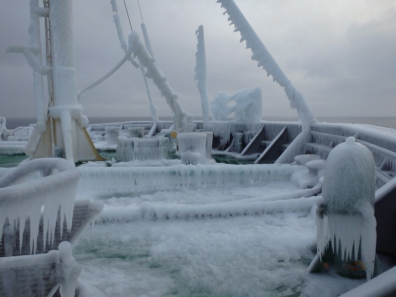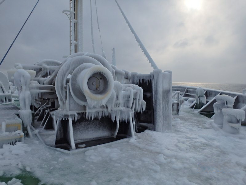 Obecnie statek przebywa w okolicach Wysp Kurylskich. Utrzymuje od nich dystans ponad 60 mil morskich, aby ustrzec się zagrożenia w postaci dryfujących pól lodowych, wypychanych przez wiatry spomiędzy wysp. Duże fale i mróz zrobiły jednak swoje i cały pokład „Karpat” pokrył się lodem.