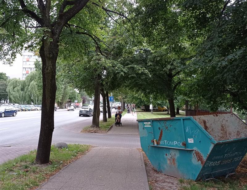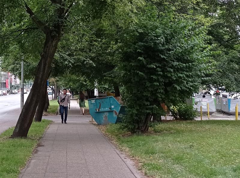 Choć obok jest spory betonowy plac, na którym nie brakuje miejsca zarówno dla samochodów, jak i szpetnych stalowych kolosów do segregacji odpadów, to postawili go na trawniku. Naruszając wąski pas przyulicznego zieleńca przy ul. Malczewskiego. Oto jak wygląda praktyka utrzymania miejskiej zieleni, gdy nie są przestrzegane jej standardy. Trawnik to nie miejsce do parkowania kontenerów, o czym powinna przypominać również straż miejska, także w Szczecinie.