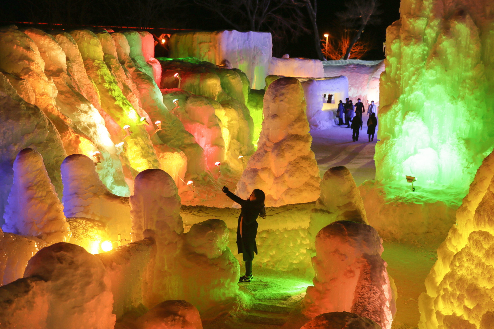 Japonka robi sobie selfie przy kolorowej iluminacji stworzonej na lodowych rzeźbach. Do 21 lutego potrwa w jednym z japońskich miast festiwal lodu.