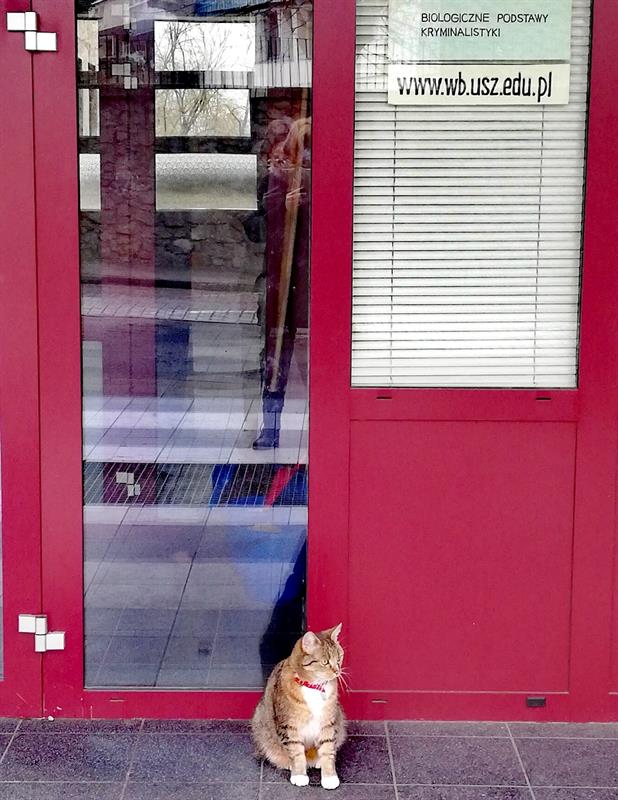 Biologiczne Podstawy Kryminalistyki na Wydziale Nauk Ścisłych i Przyrodniczych Uniwersytetu Szczecińskiego przy ulicy Felczaka w Szczecinie przyciągnęły oryginalnego gościa - przystojnego, postawnego kota, bardzo charakterystycznego, bo bez ogona za to z elegancką obróżką. Trwają ustalenia, czy przybył tu w charakterze studenta czy wykładowcy. Przeważa opinia, że kot, potencjalny „morderca" ptaków i myszy, jest praktykiem i jako taki może być zatrudniony na etacie profesora dydaktycznego... Ale żarty na bok. Urocza kicia jest dobrze znana w okolicy uniwersyteckiego budynku i być może pełni w nim po prostu funkcję „chief mouser'a" (czyli kierownika do spraw zarządzania myszami), a może zagląda na uczelnię wyłącznie w celach towarzyskich.