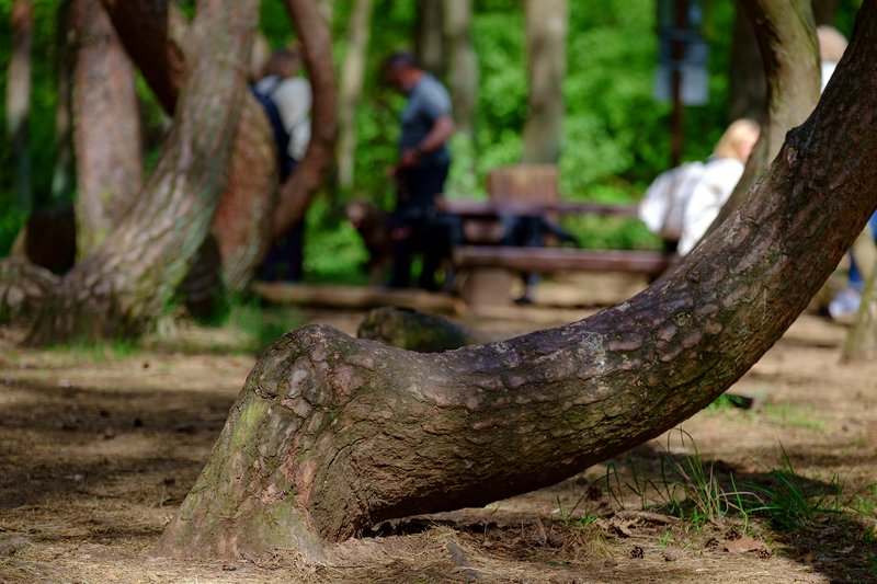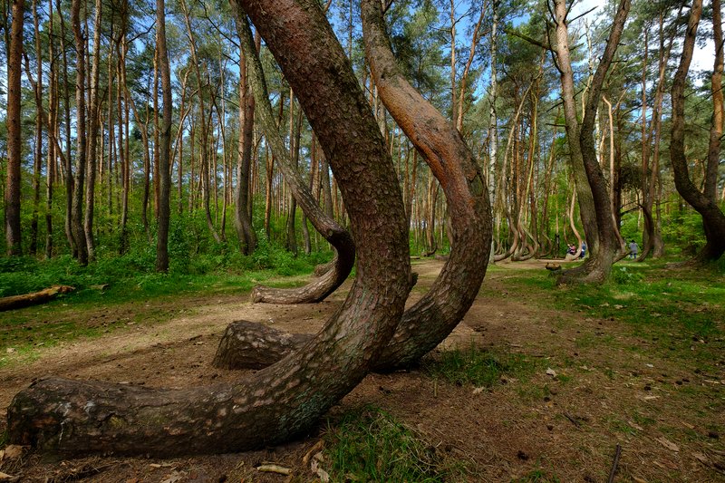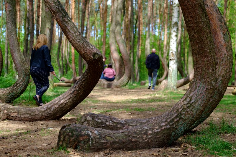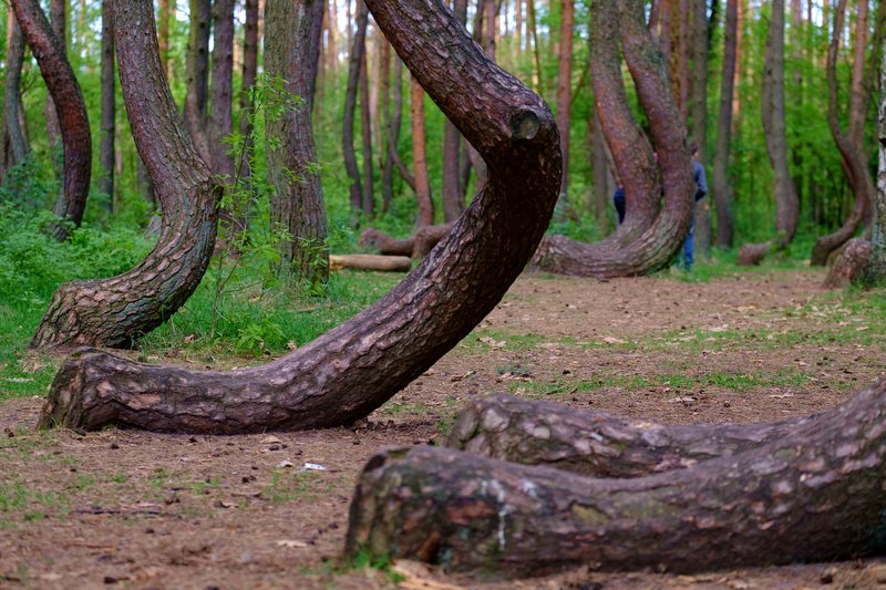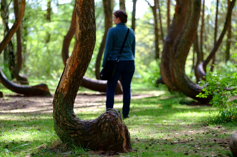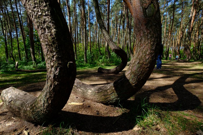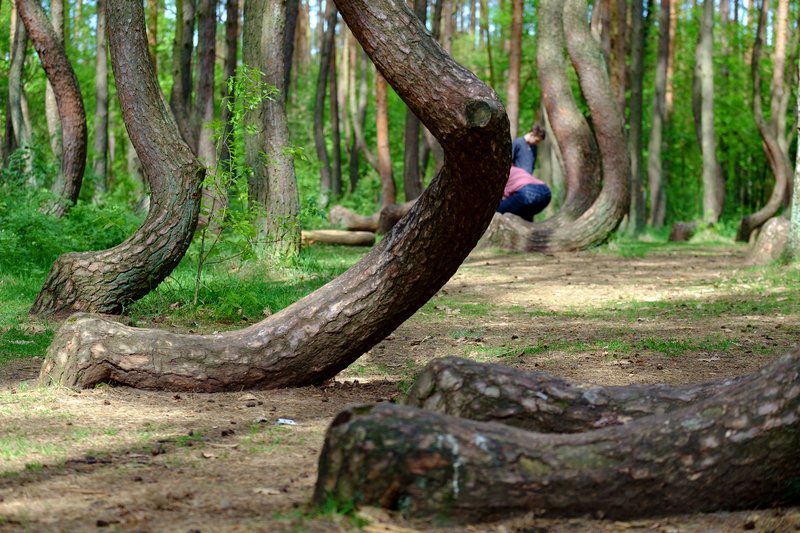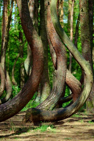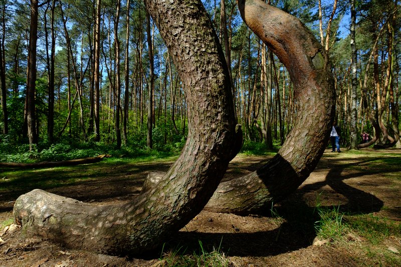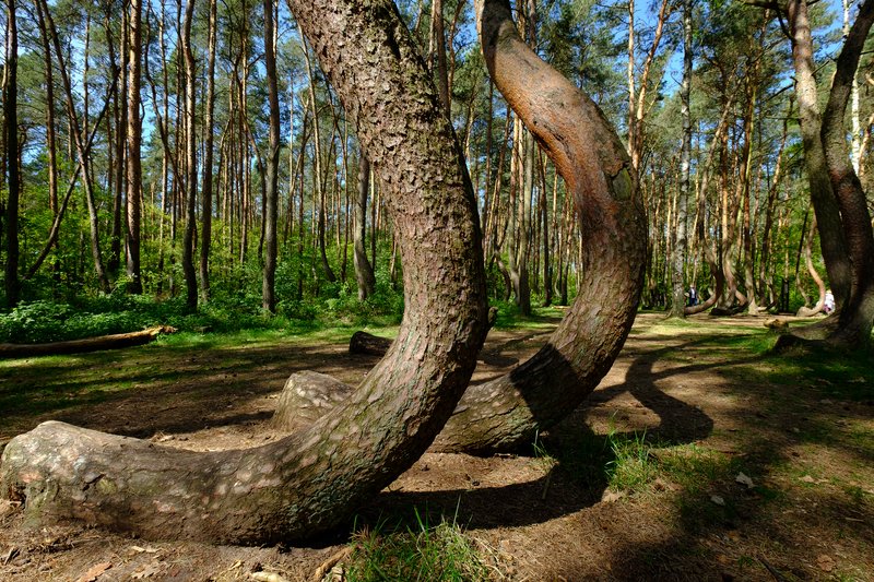 Tuż nad ziemią pień zamiast rosnąć pionowo - skręca pod kątem 90 st. i wygina się szerokim łukiem ku górze. Wszystkie pnie wygięte są w kierunku północnym. W jakim celu drzewa tak zdeformowano - nie wiadomo. Istnieje kilka hipotez na ten temat. Bez względu na to, która z nich jest prawdziwa, zobaczyć Krzywy Las naprawdę warto.