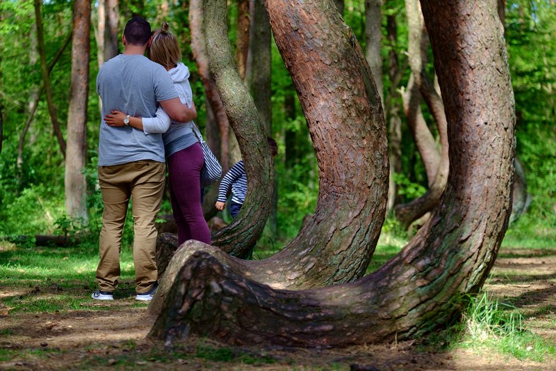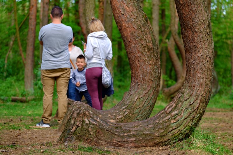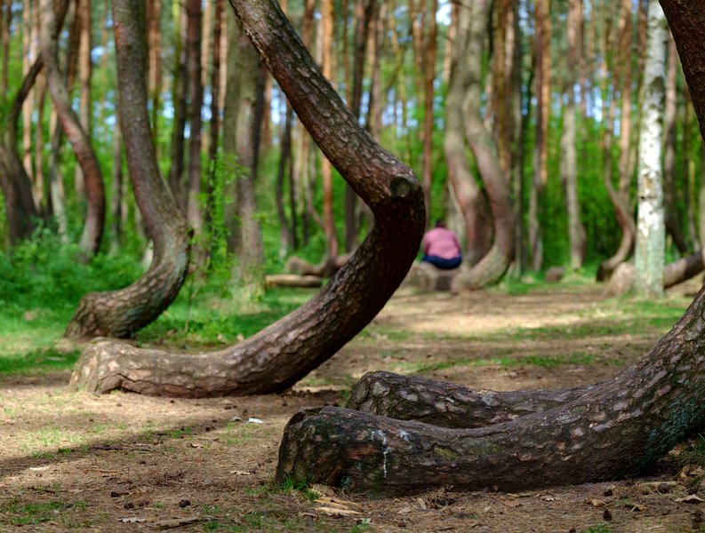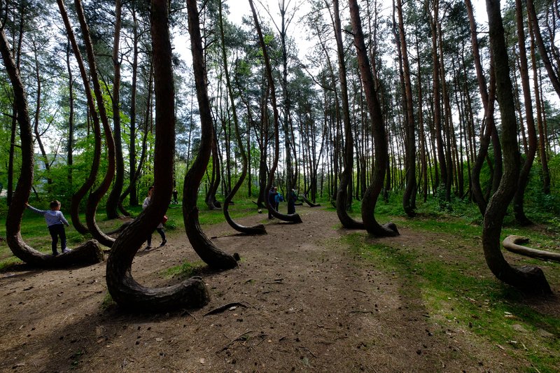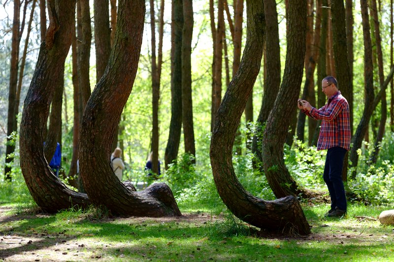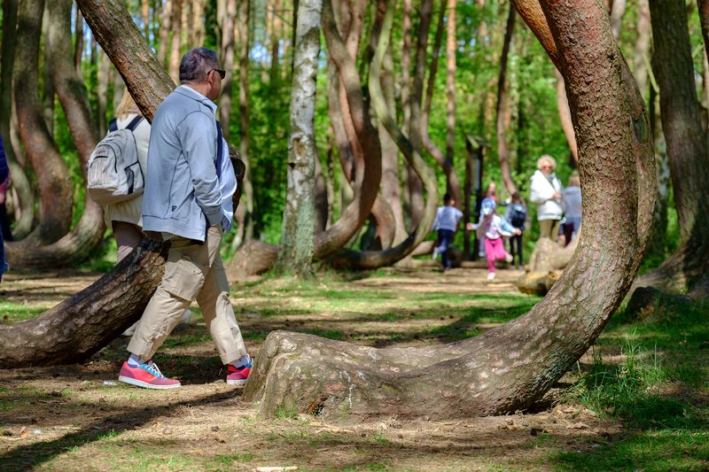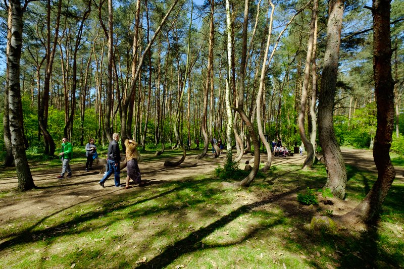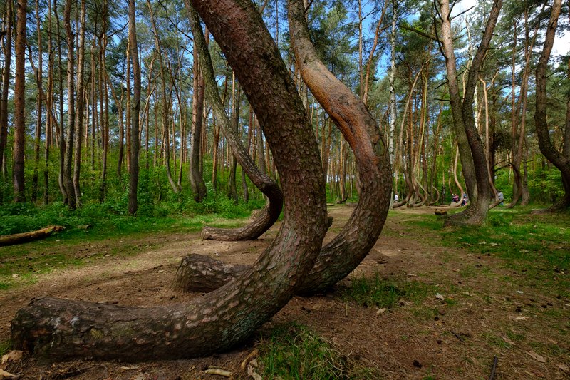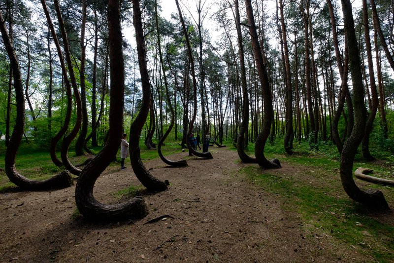 Tuż nad ziemią pień zamiast rosnąć pionowo - skręca pod kątem 90 st. i wygina się szerokim łukiem ku górze. Wszystkie pnie wygięte są w kierunku północnym. W jakim celu drzewa tak zdeformowano - nie wiadomo. Istnieje kilka hipotez na ten temat. Bez względu na to, która z nich jest prawdziwa, zobaczyć Krzywy Las naprawdę warto.